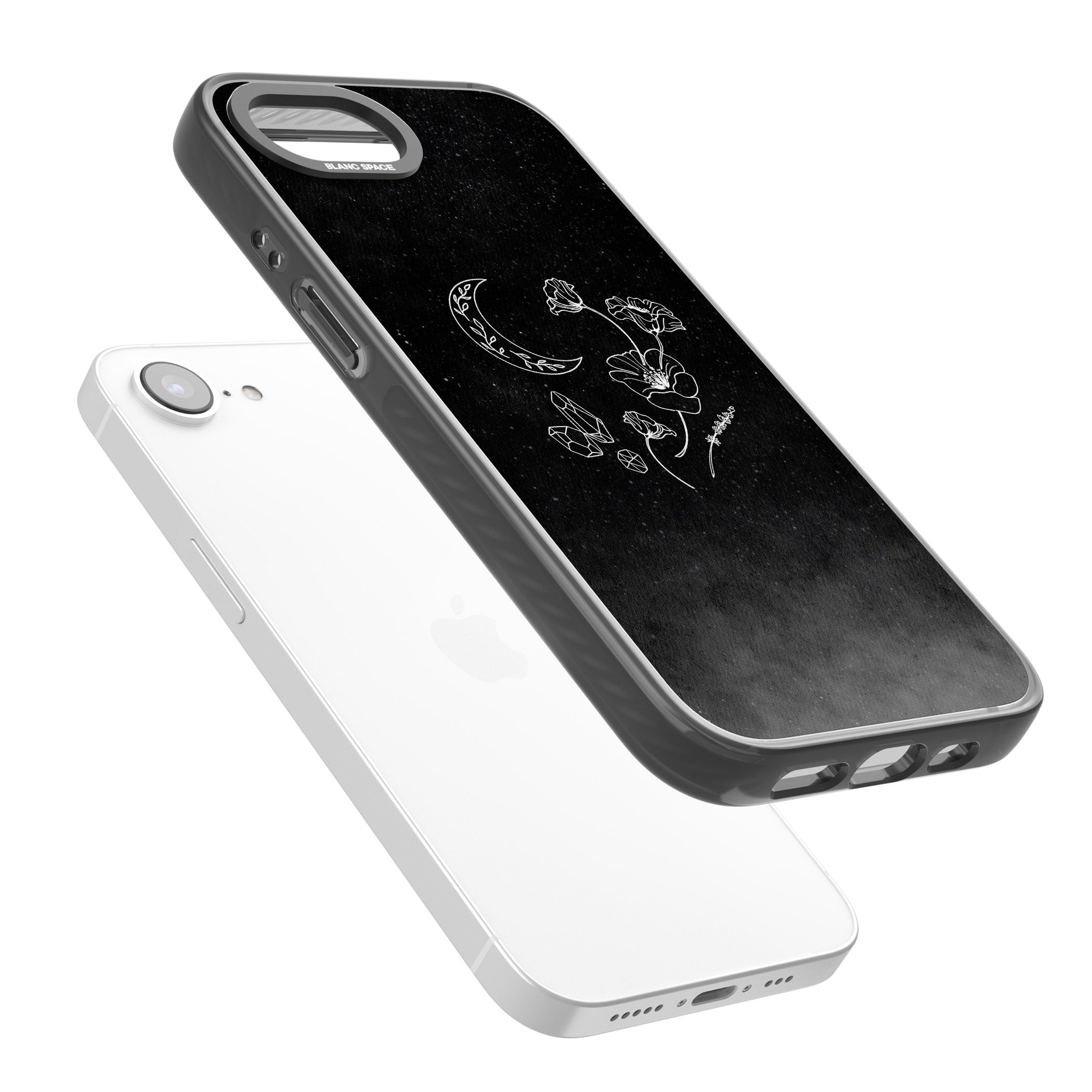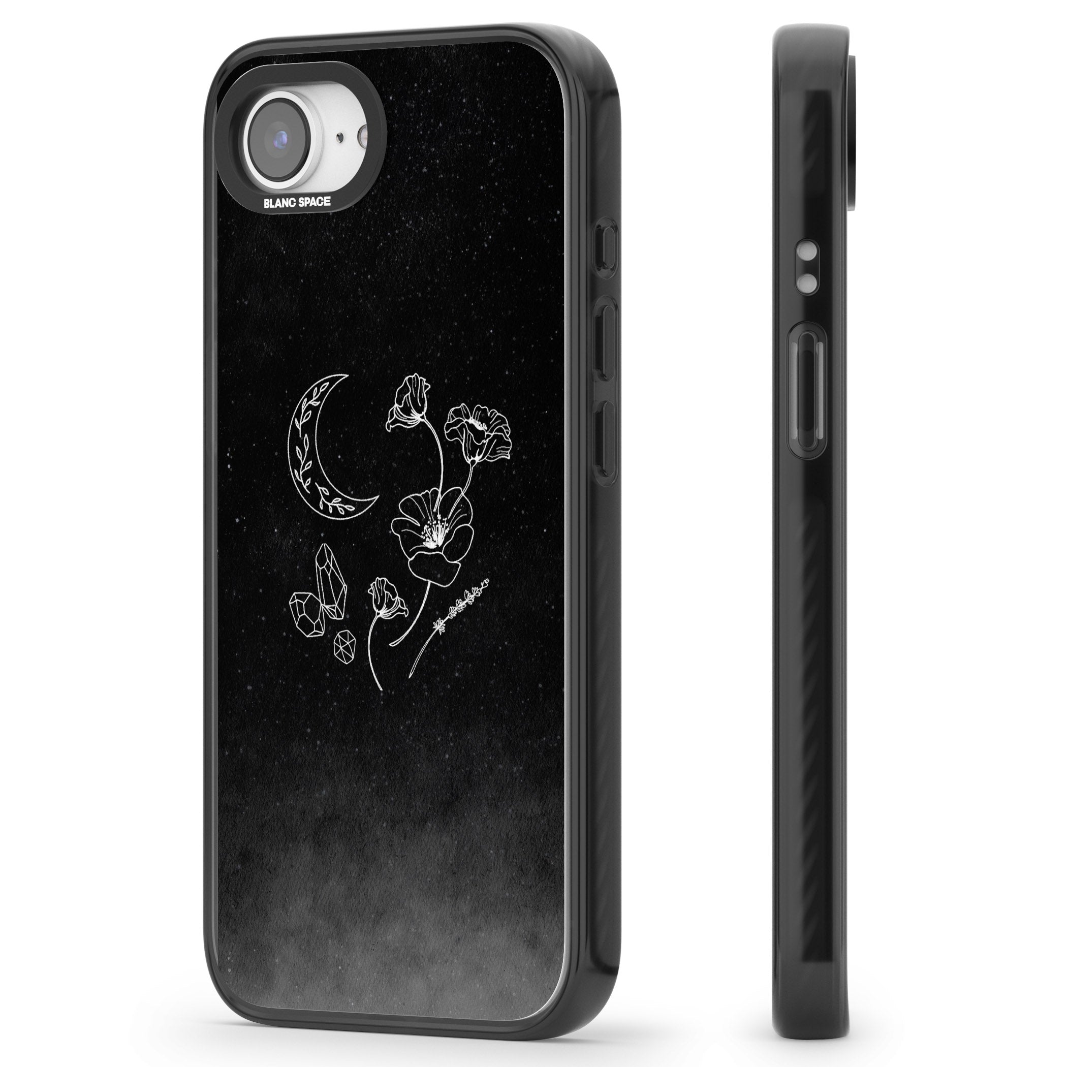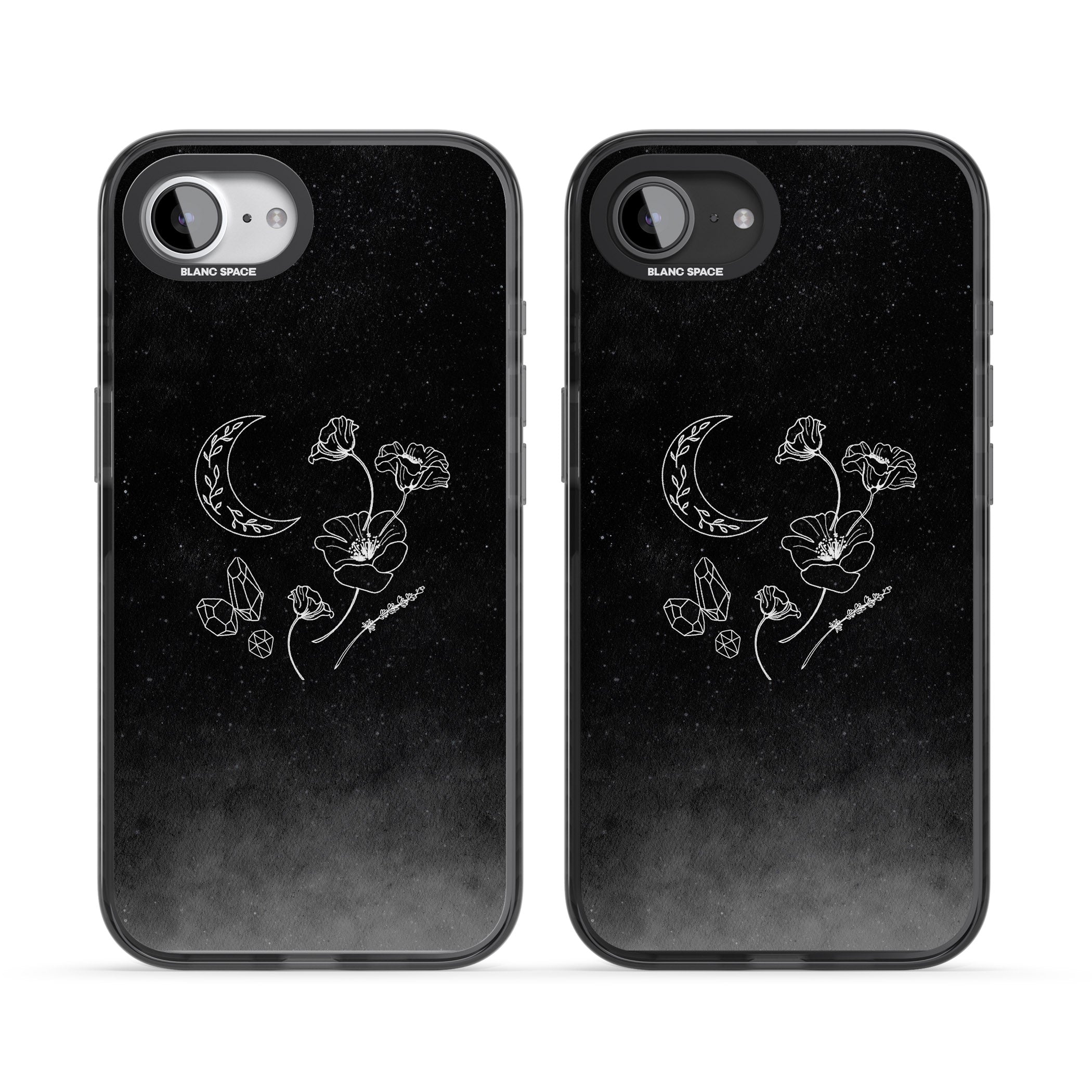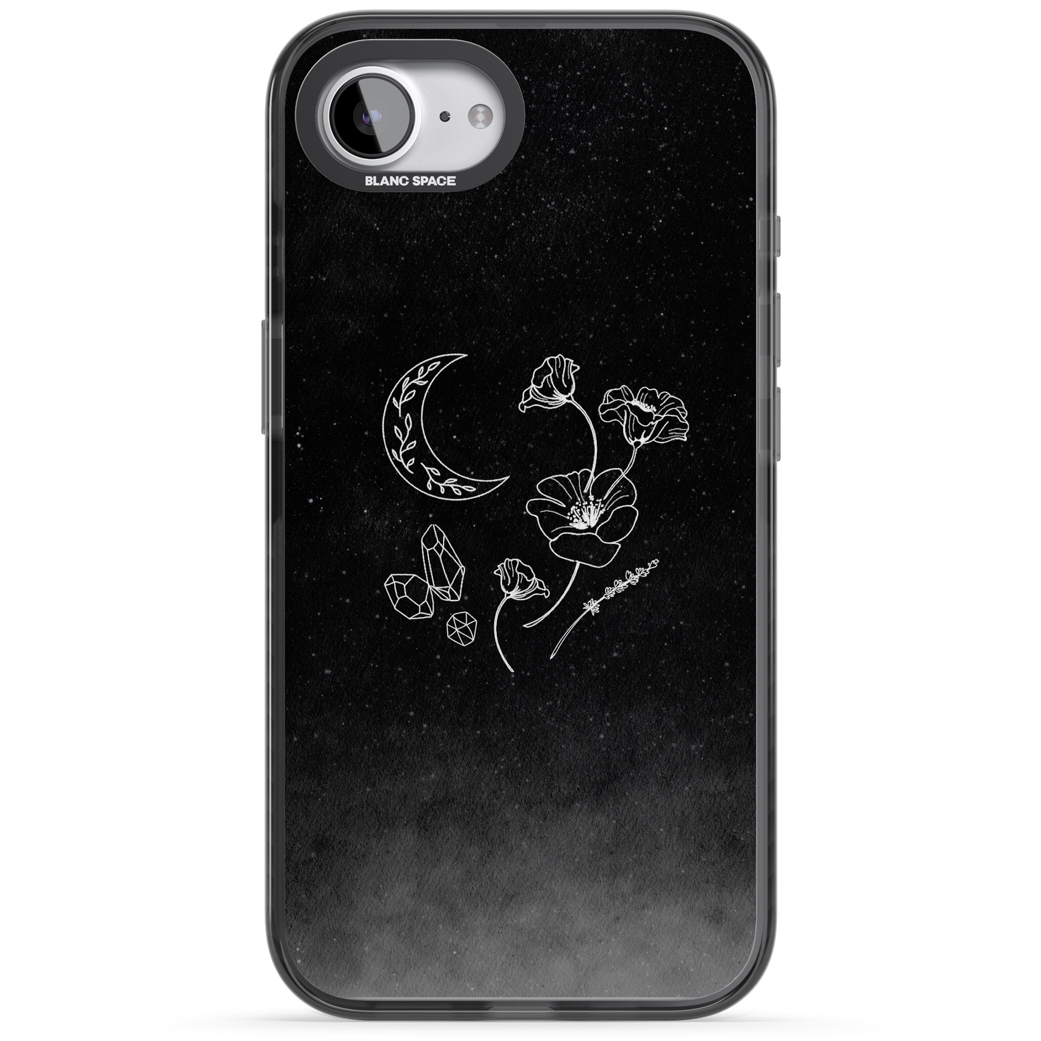 Celestial meets botanical in this nighttime dreamscape. A black backdrop sets the stage for delicate white line art — featuring a leafy crescent moon, blooming florals, and mystical crystals. It’s minimalist magic with serious mood.