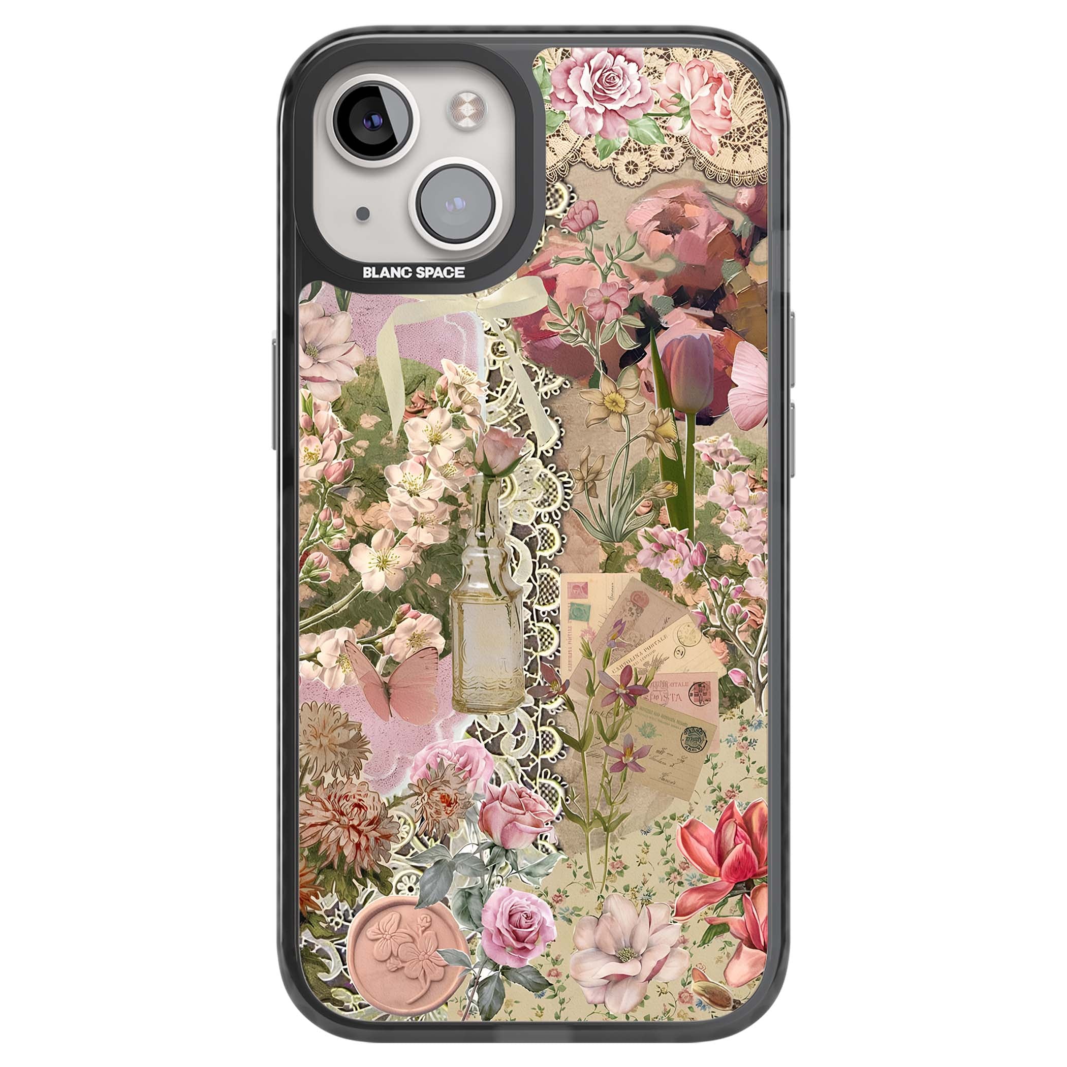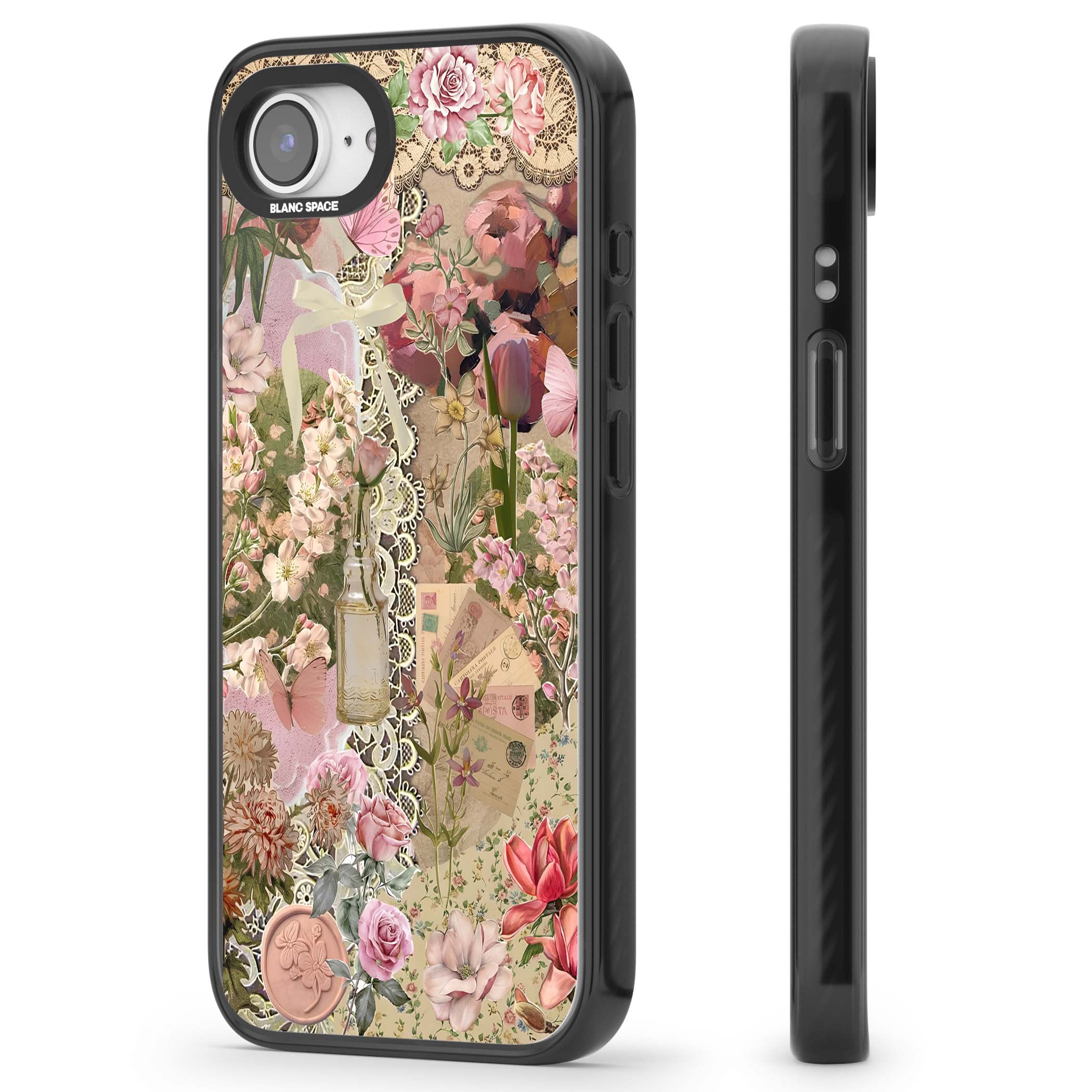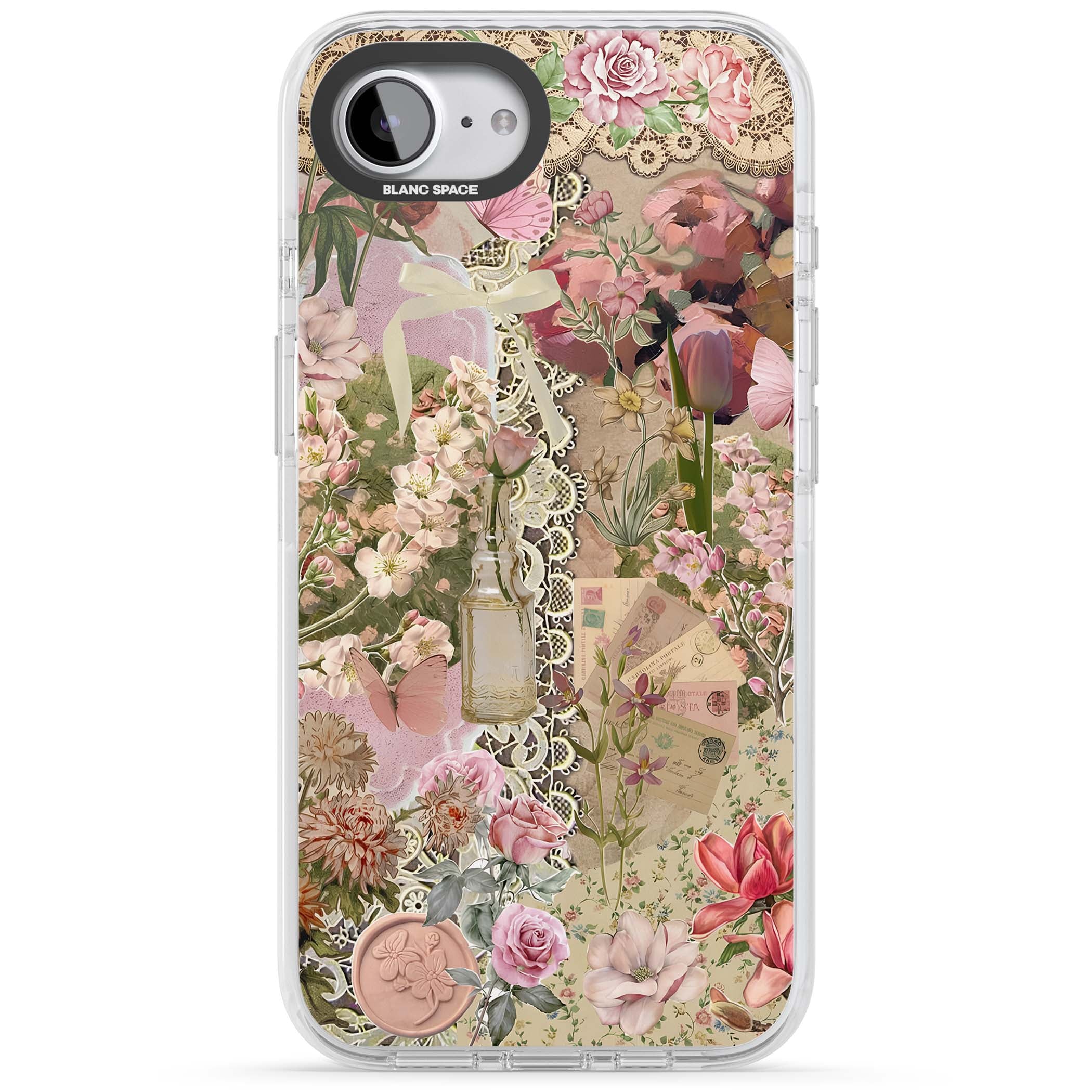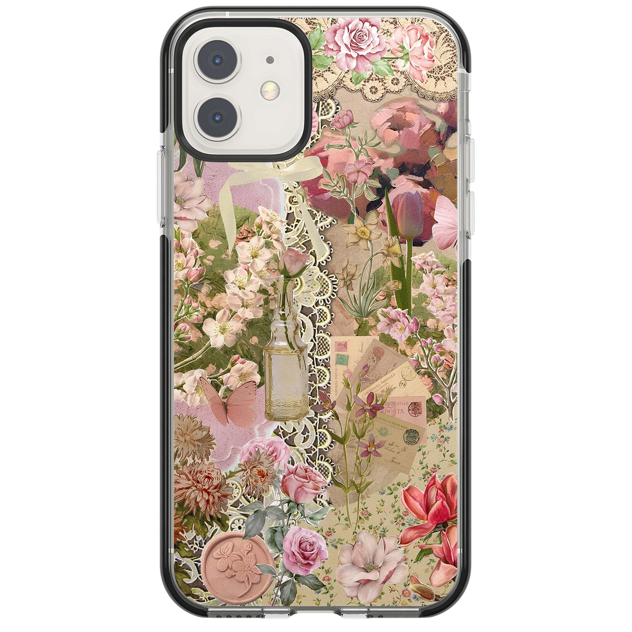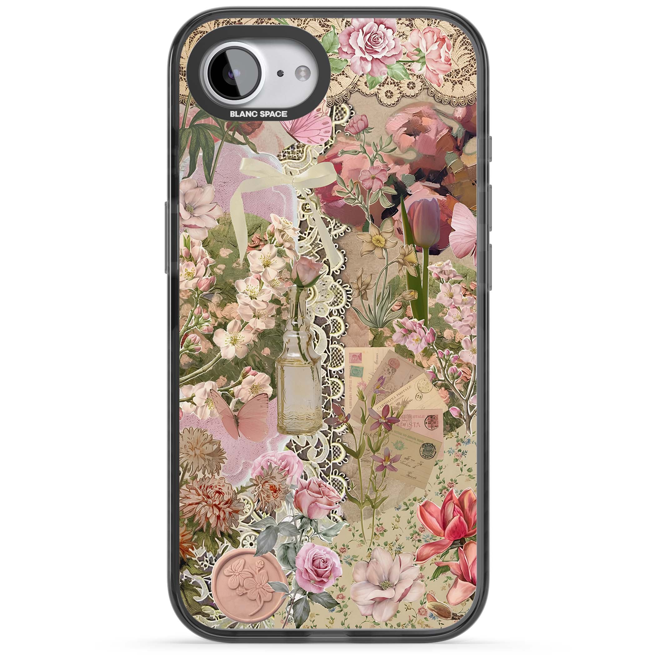 A romantic blend of pink florals, lace, letters, butterflies, and vintage perfume bottles, this phone case is a perfect match for those who adore soft, feminine aesthetics.