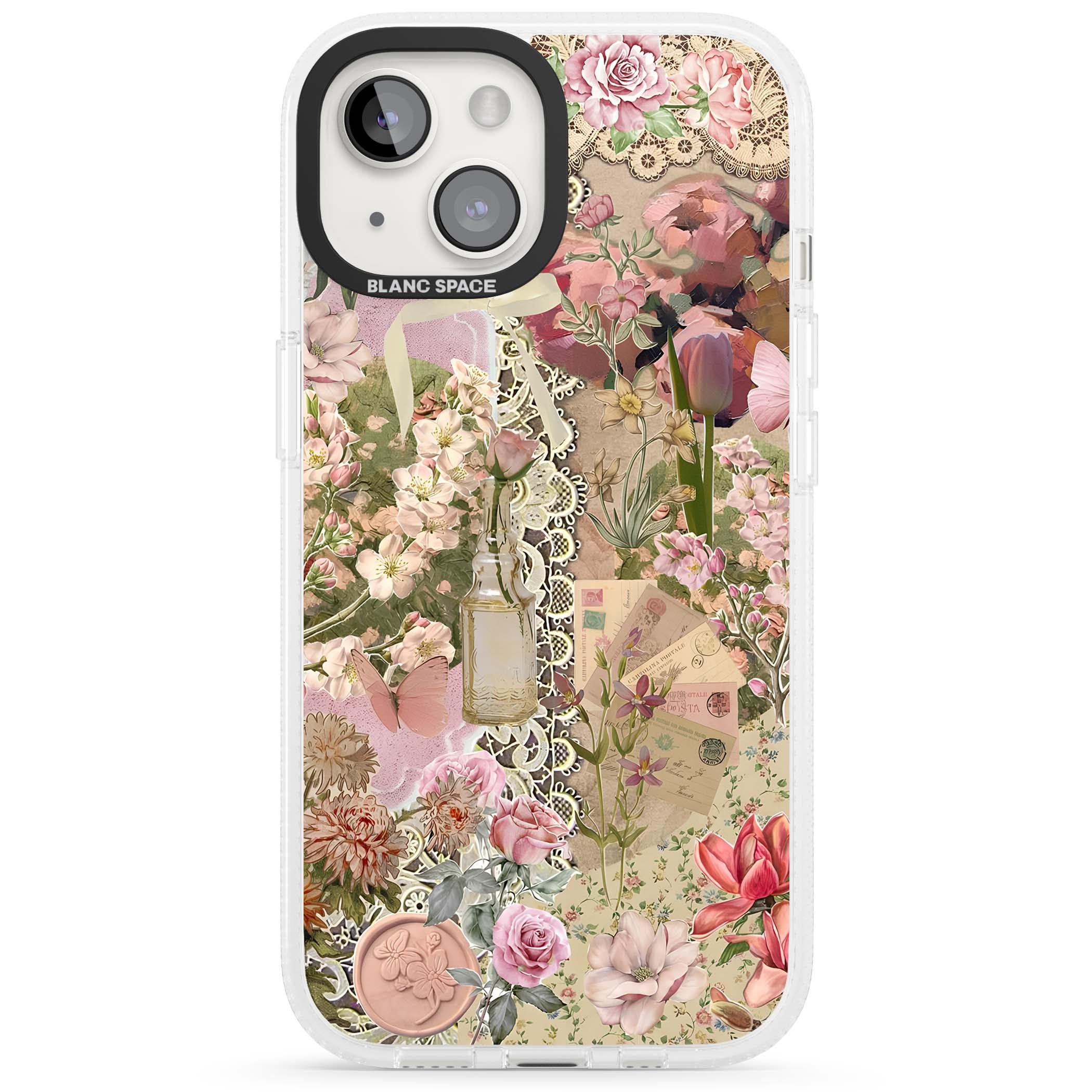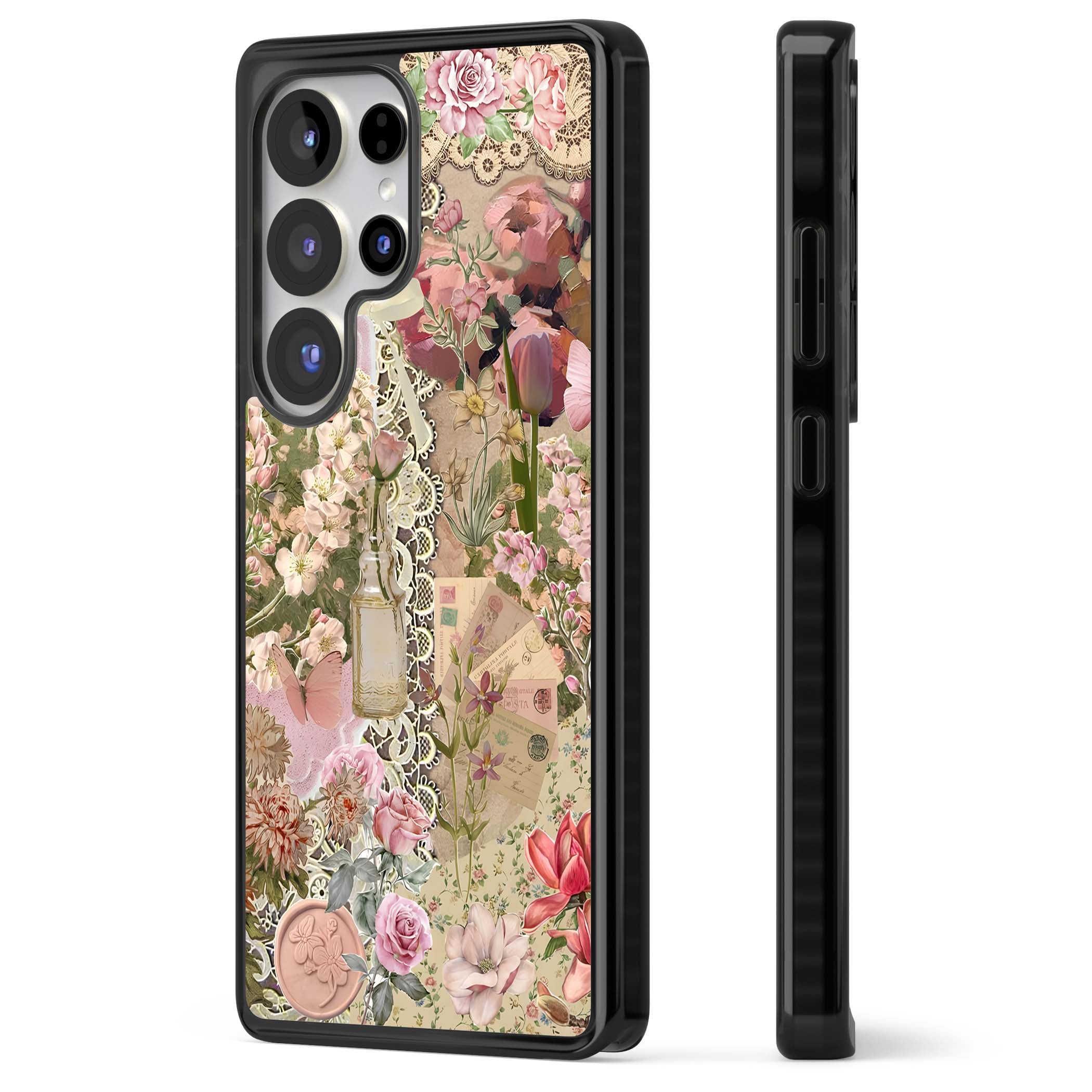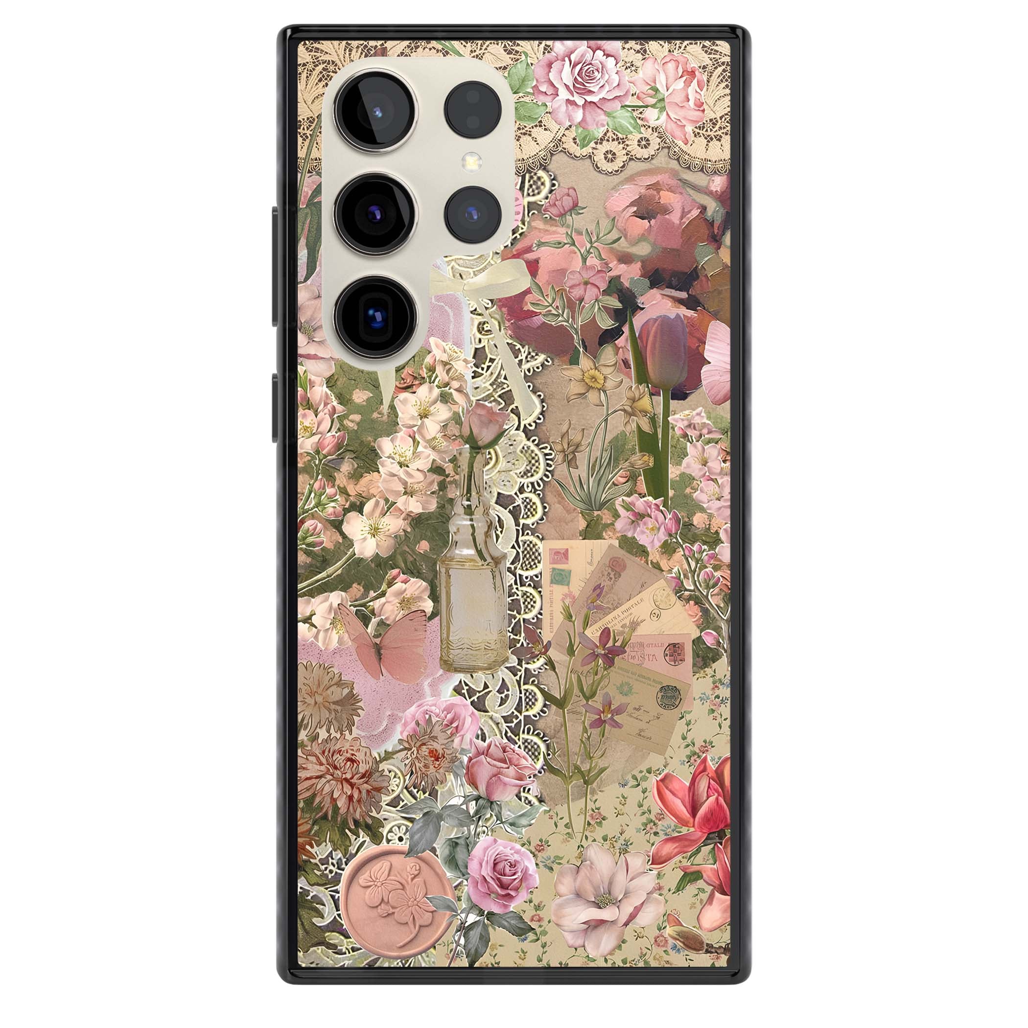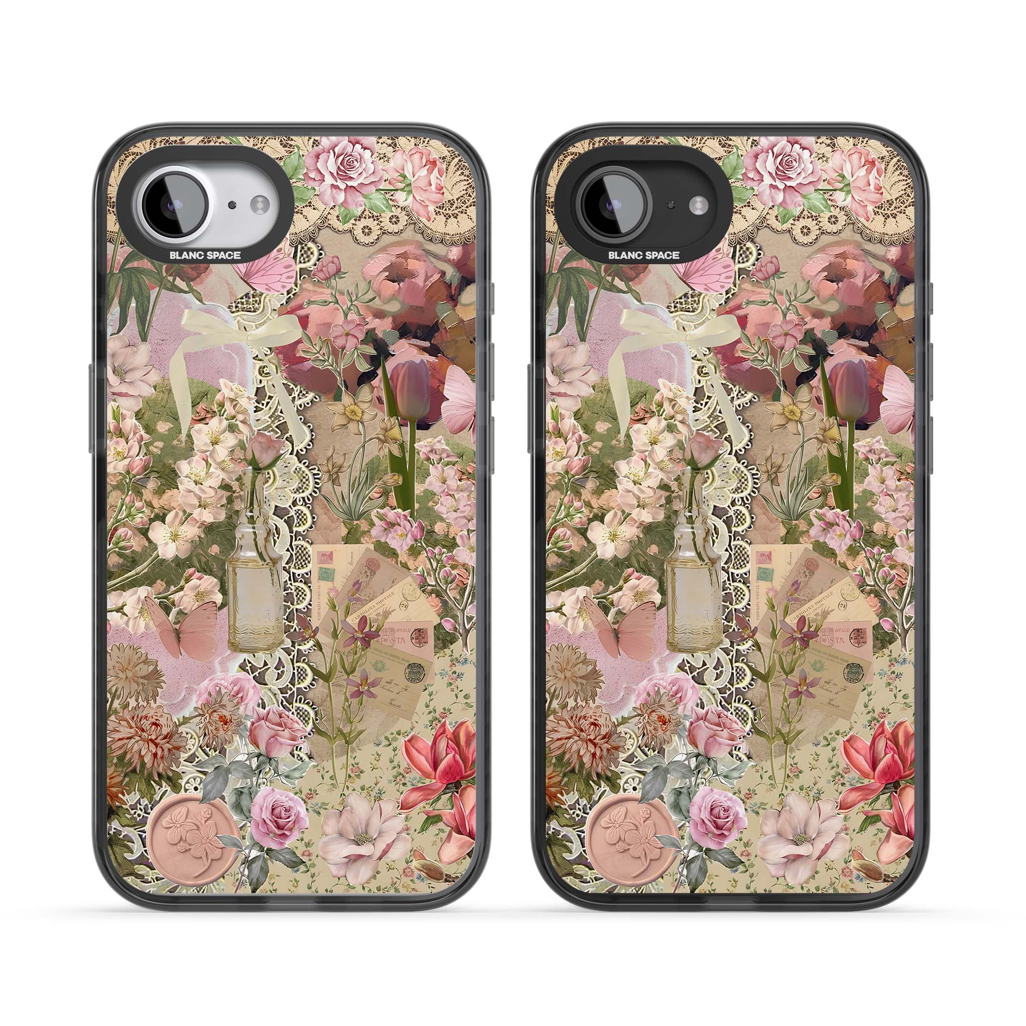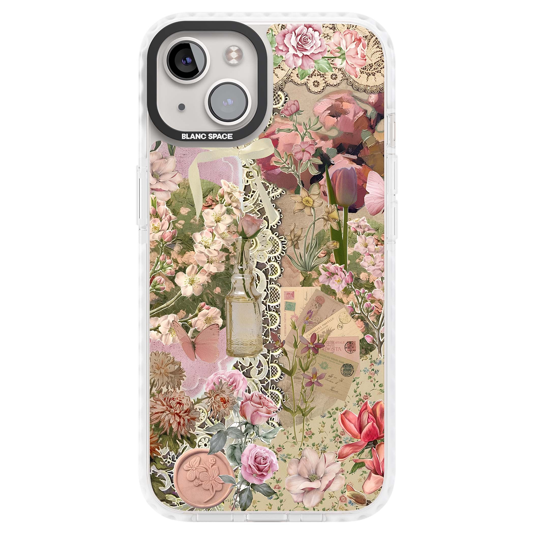 A romantic blend of pink florals, lace, letters, butterflies, and vintage perfume bottles, this phone case is a perfect match for those who adore soft, feminine aesthetics.