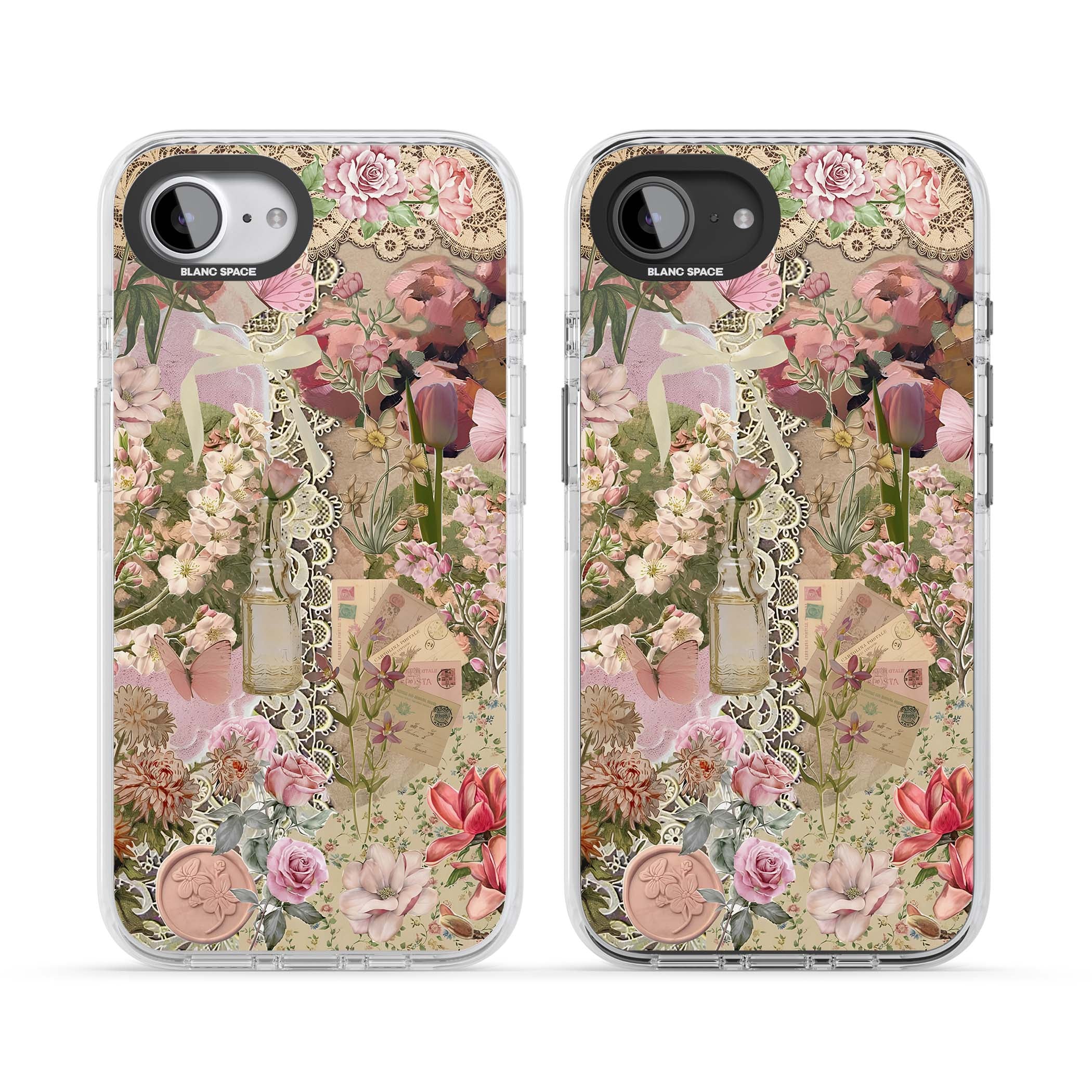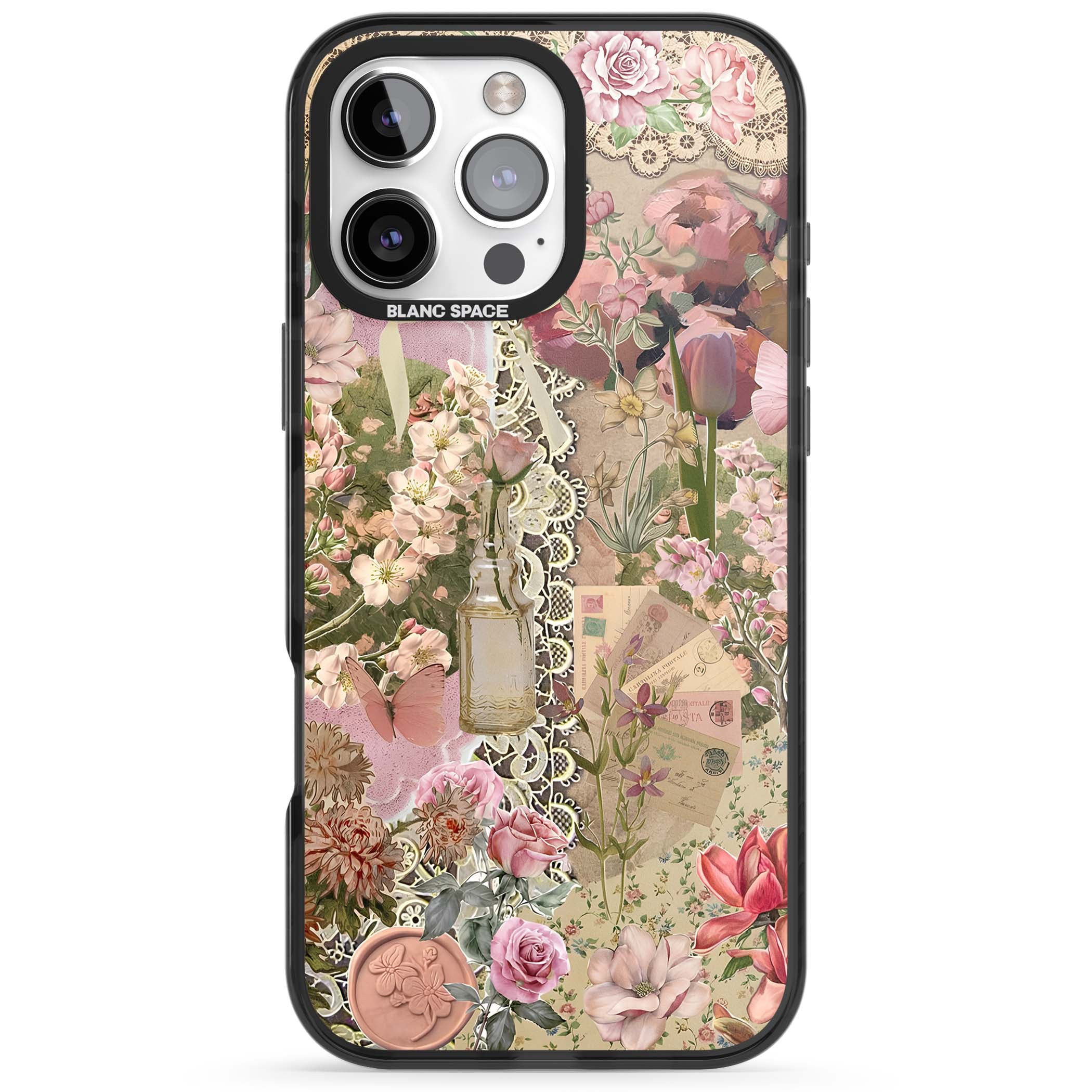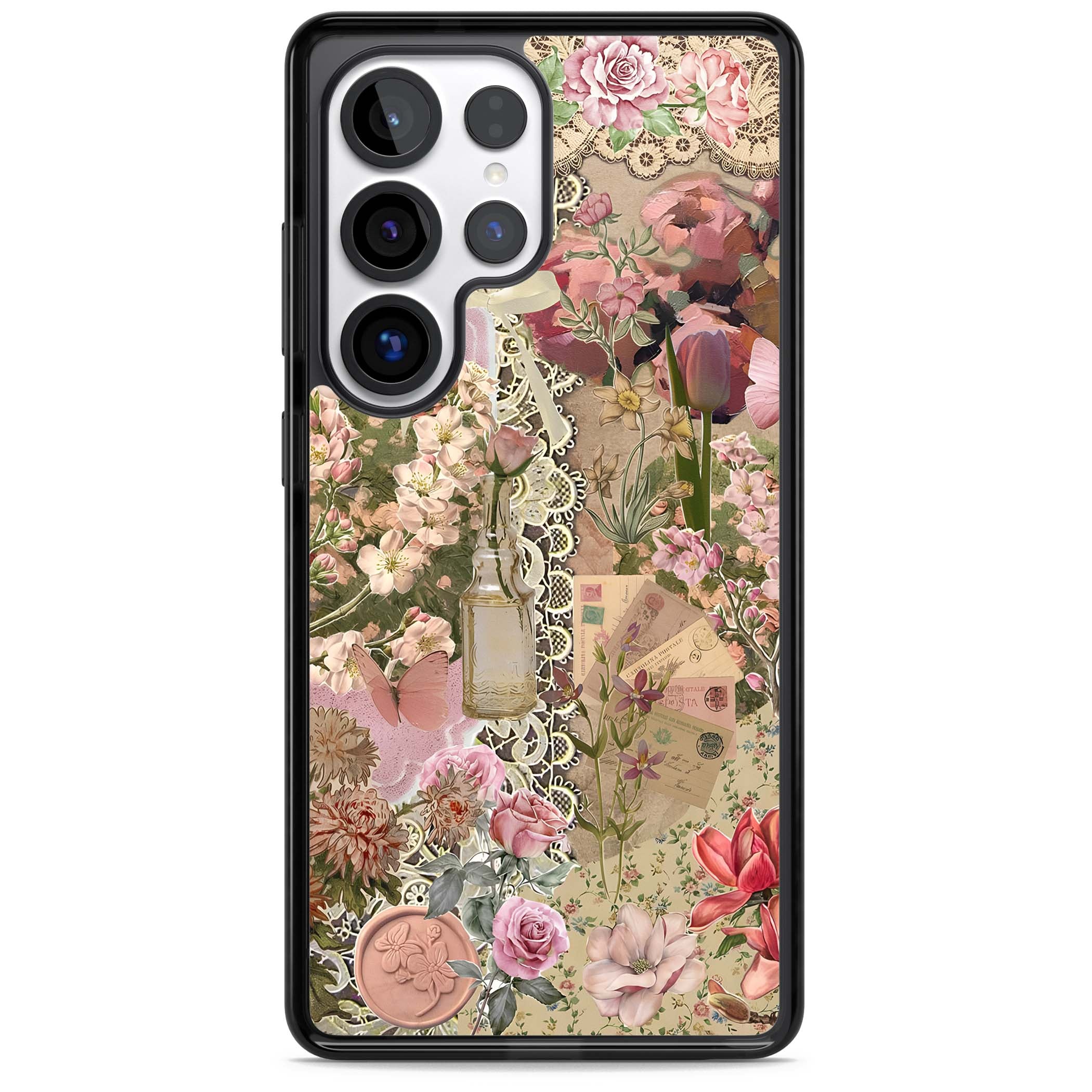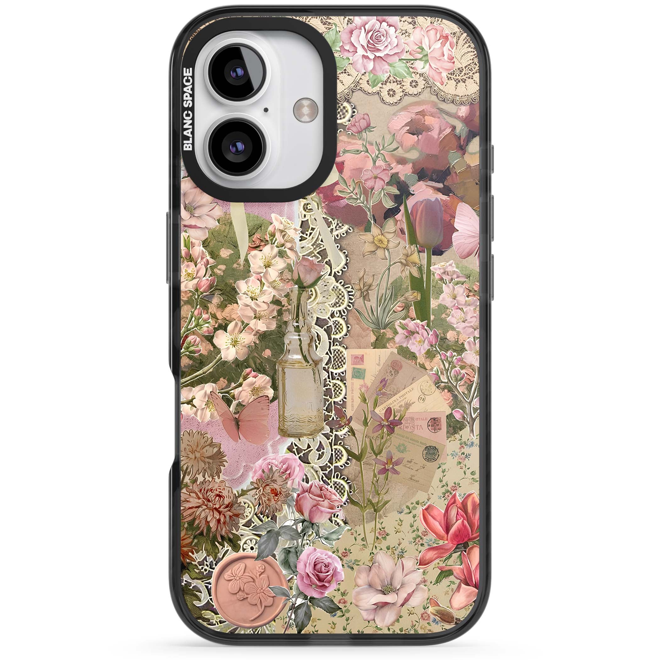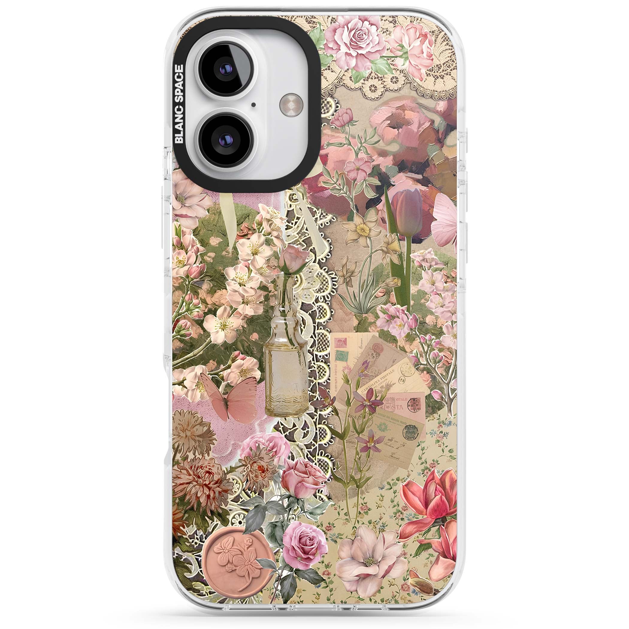 A romantic blend of pink florals, lace, letters, butterflies, and vintage perfume bottles, this phone case is a perfect match for those who adore soft, feminine aesthetics.