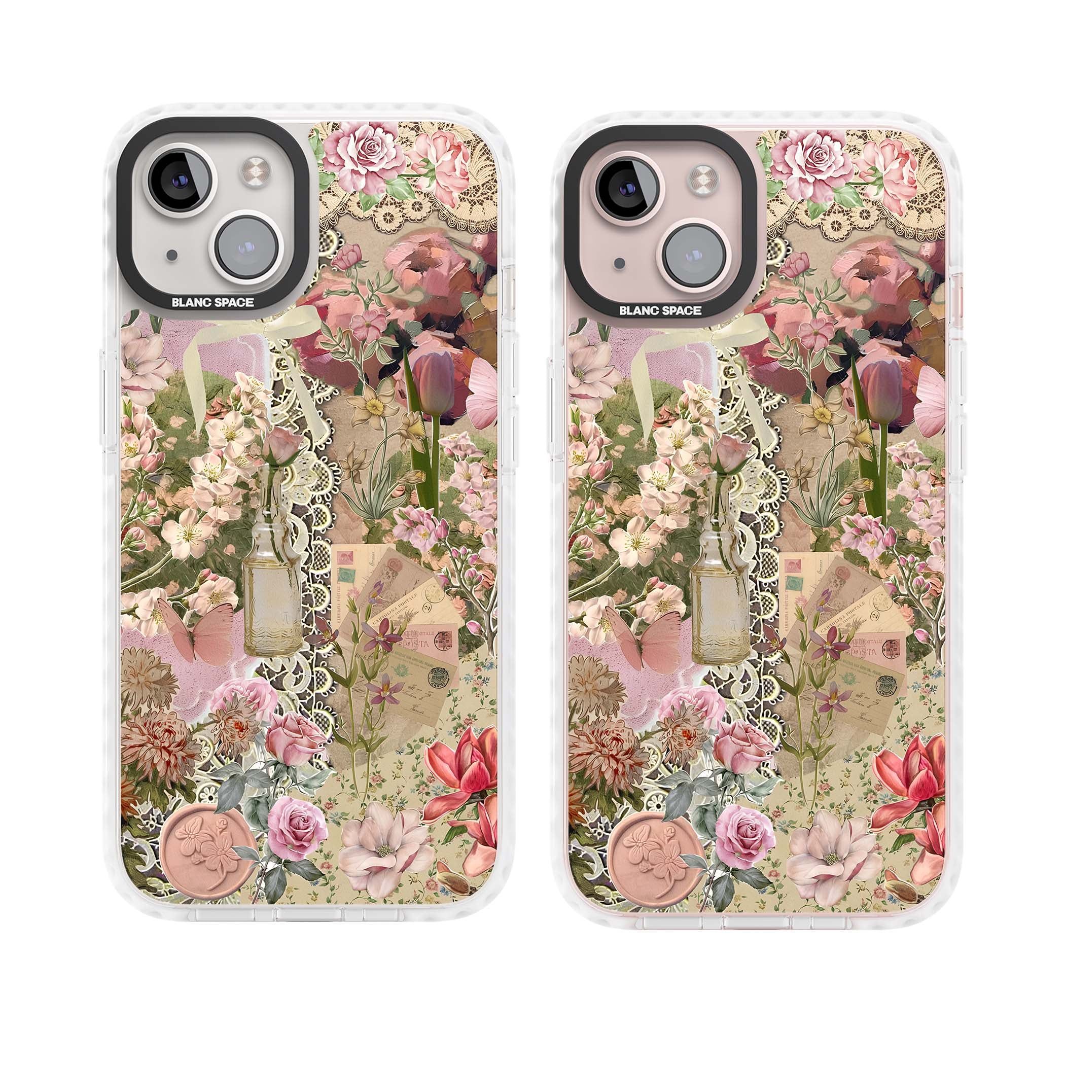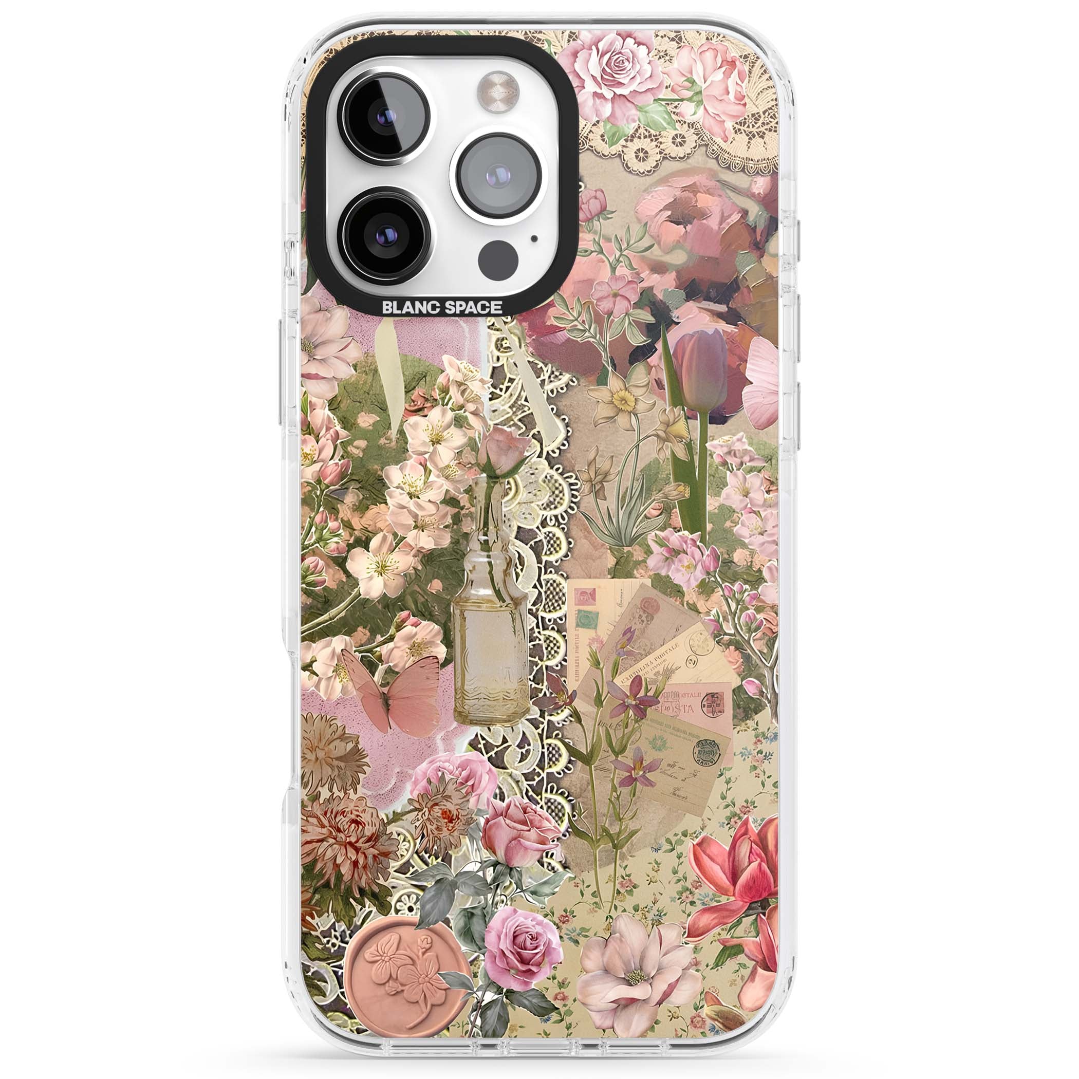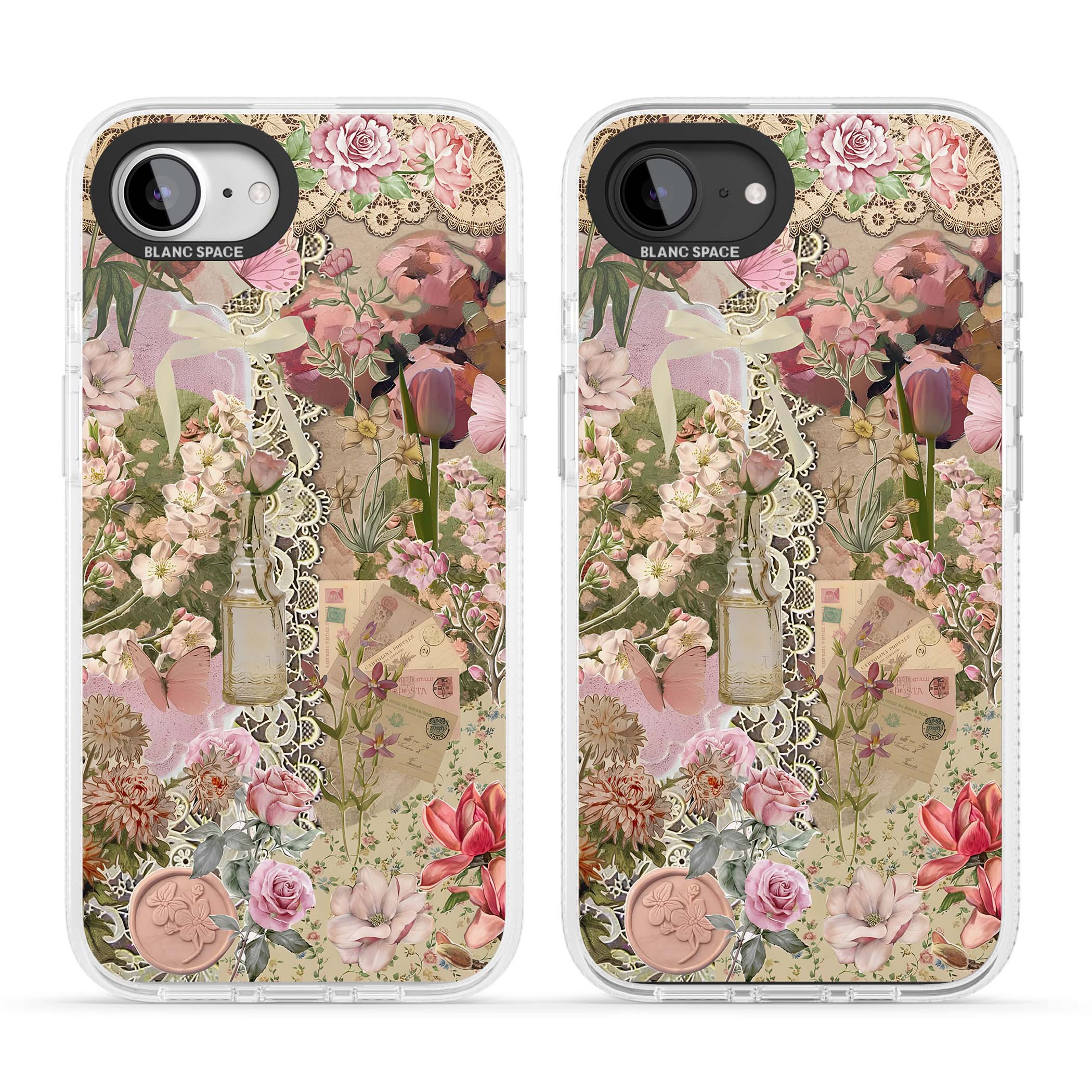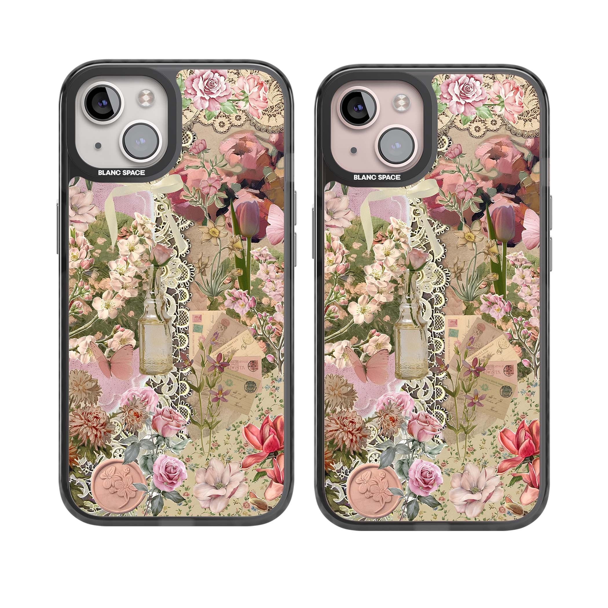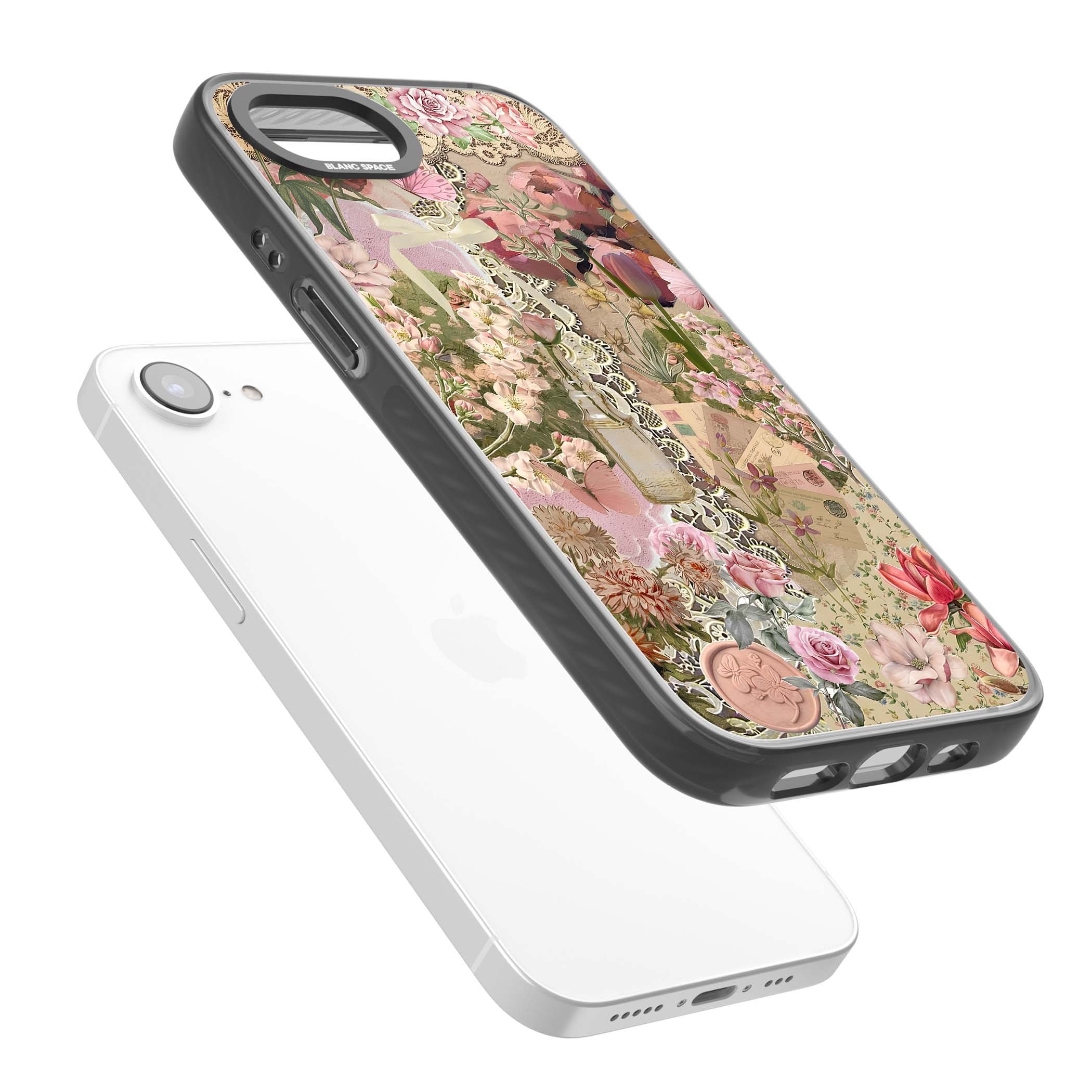 A romantic blend of pink florals, lace, letters, butterflies, and vintage perfume bottles, this phone case is a perfect match for those who adore soft, feminine aesthetics.