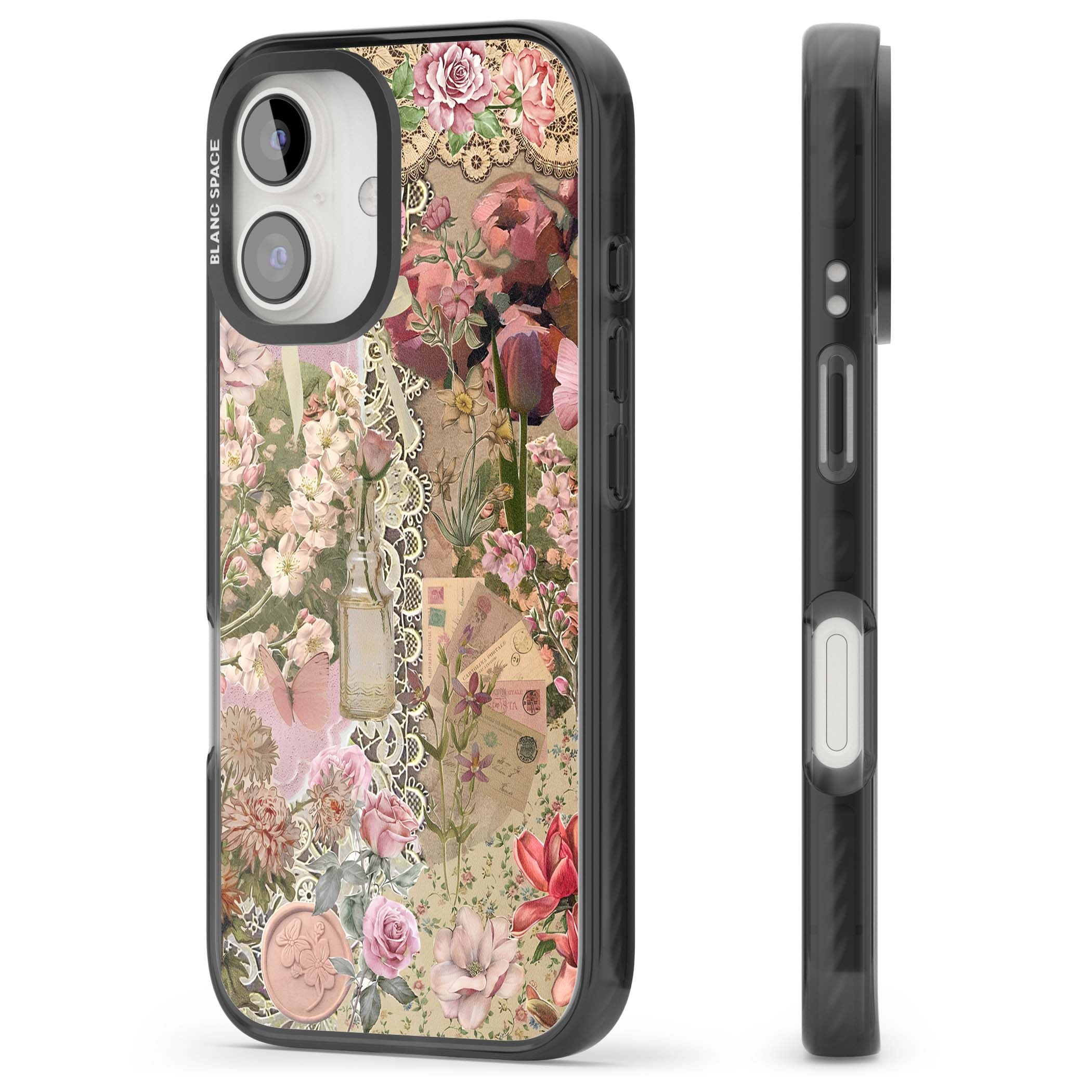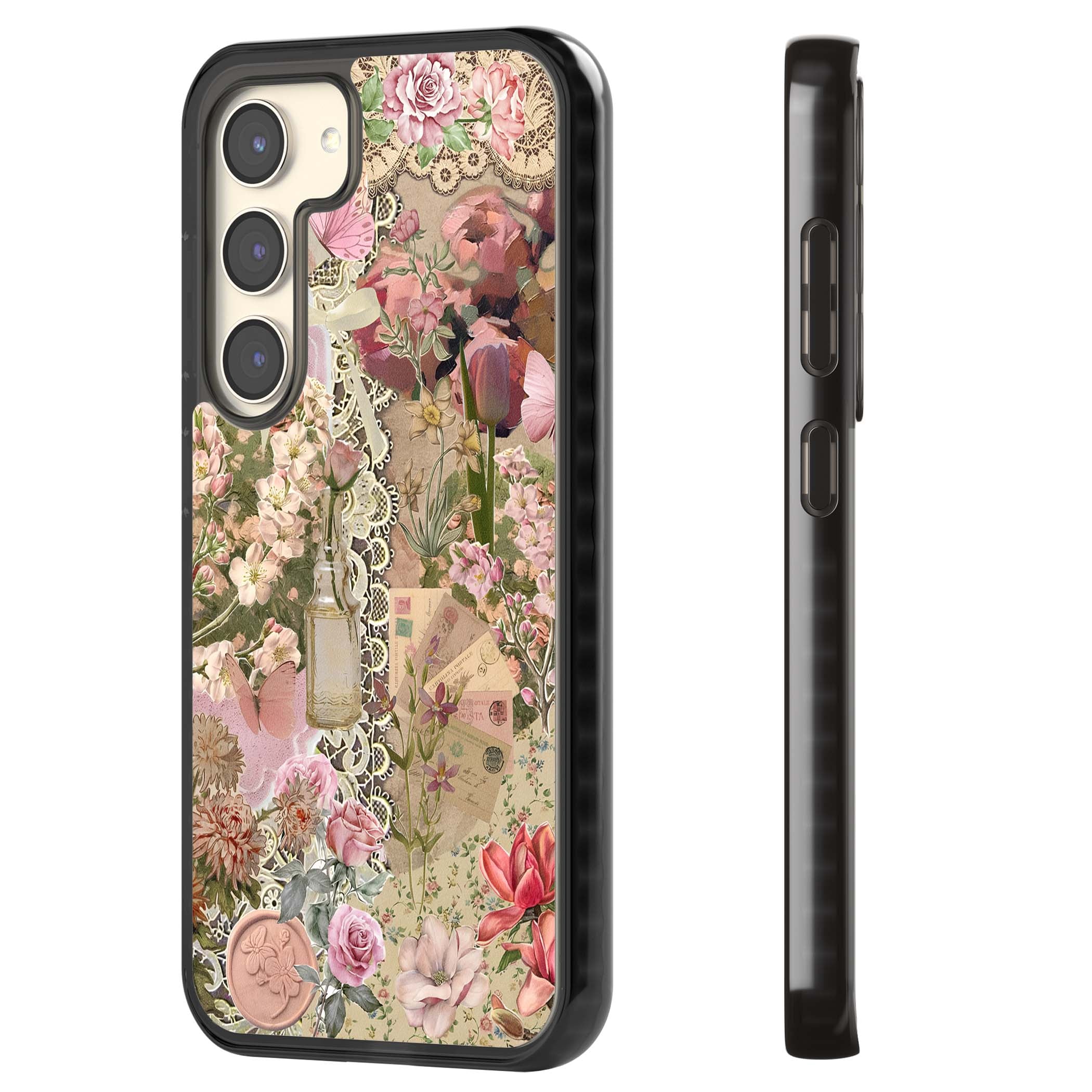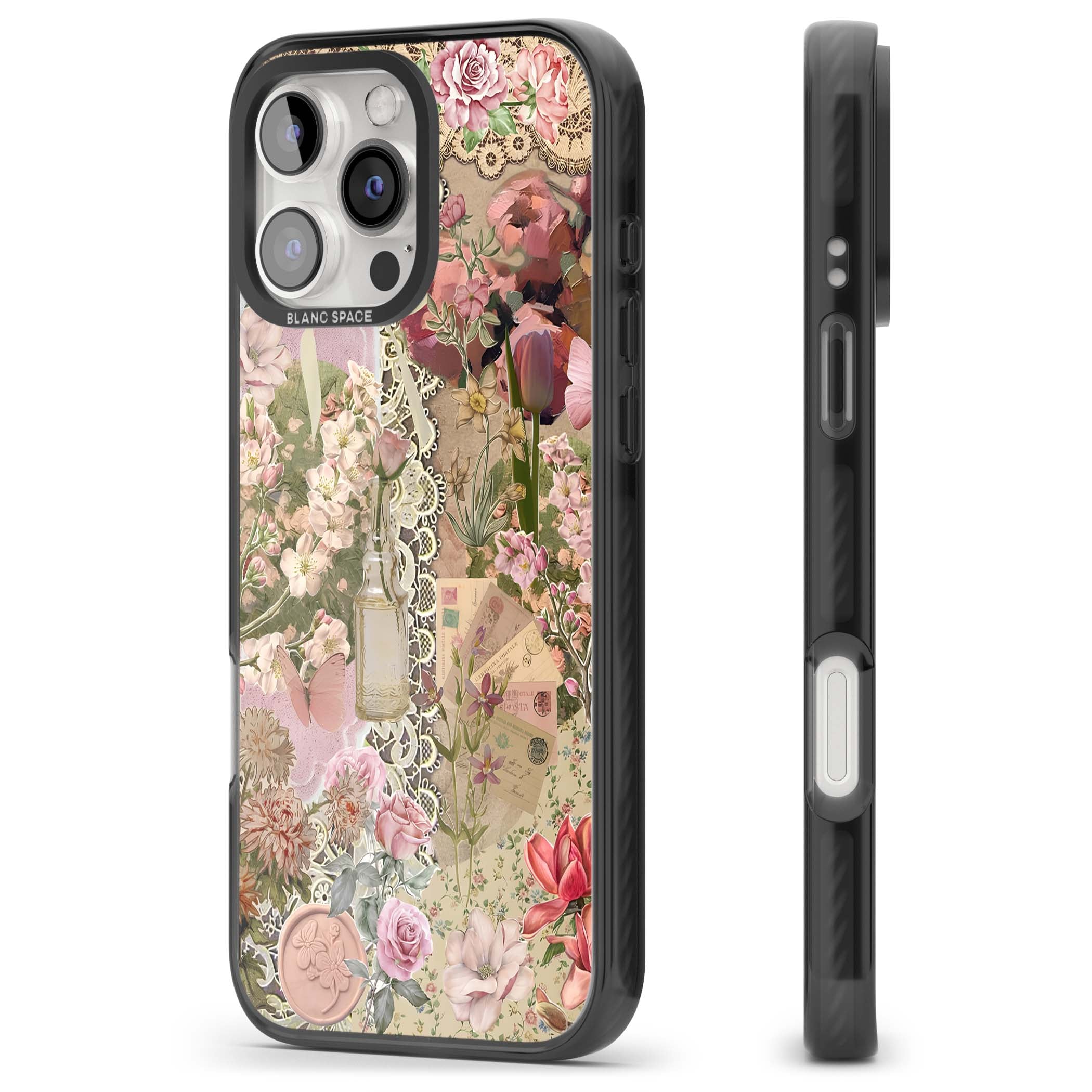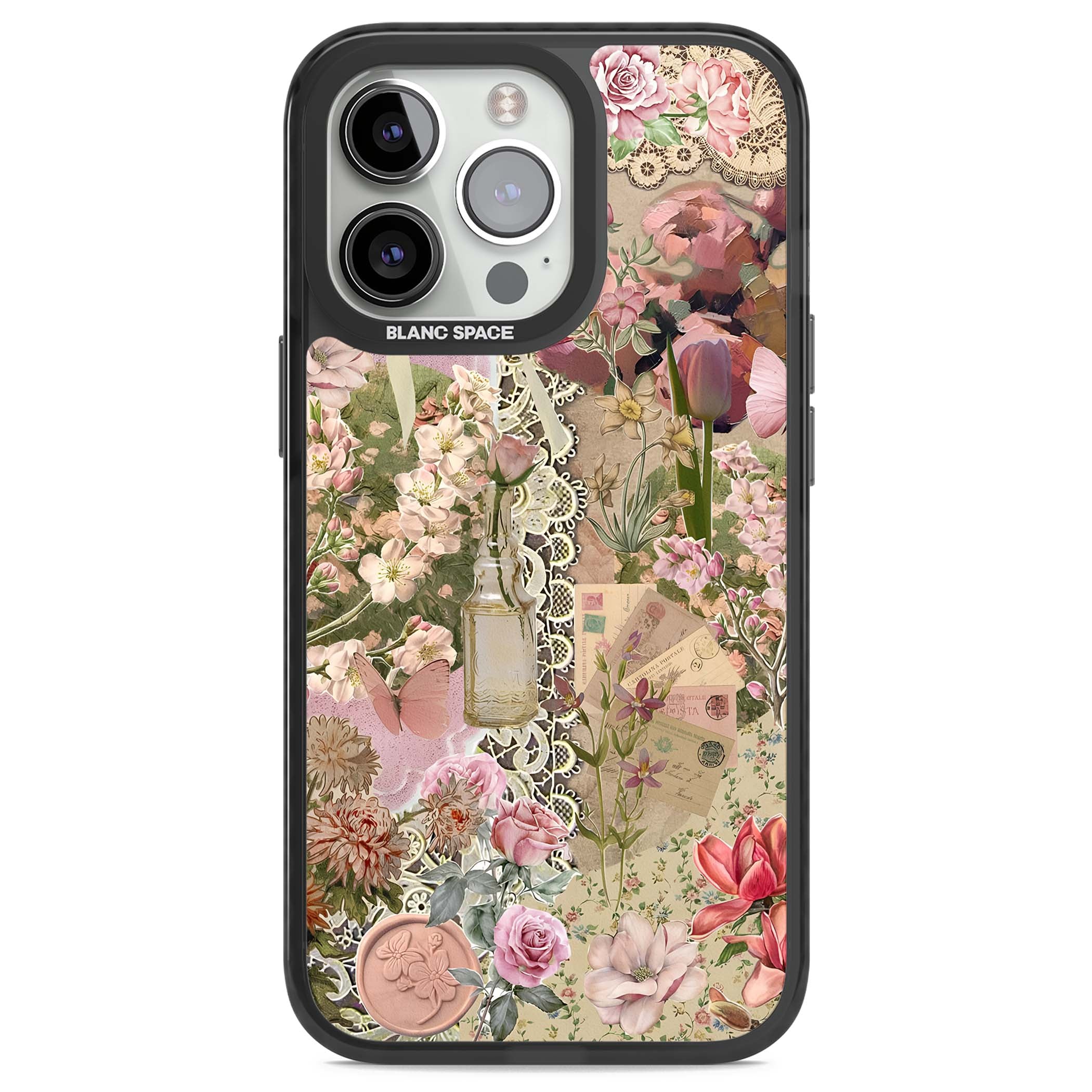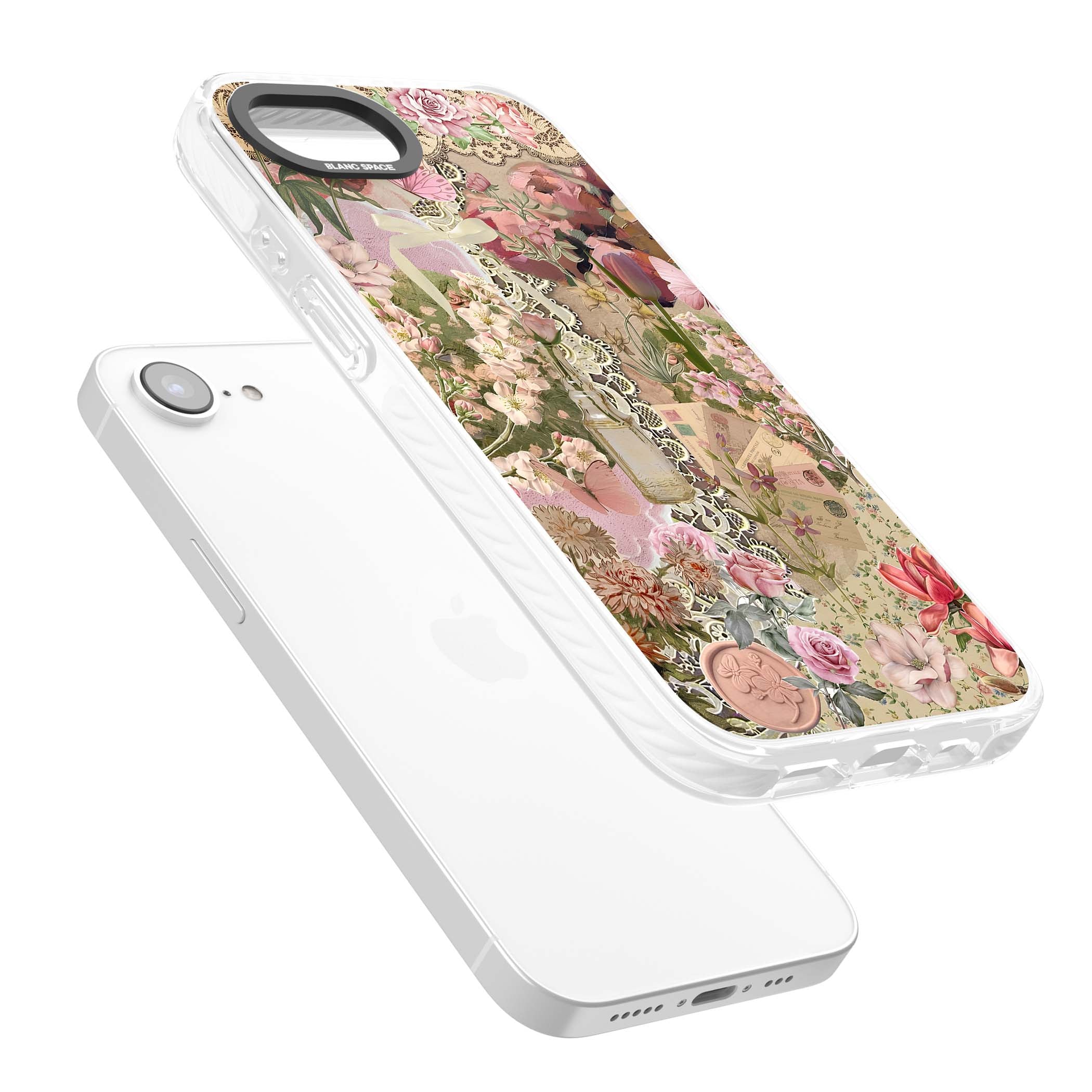 A romantic blend of pink florals, lace, letters, butterflies, and vintage perfume bottles, this phone case is a perfect match for those who adore soft, feminine aesthetics.