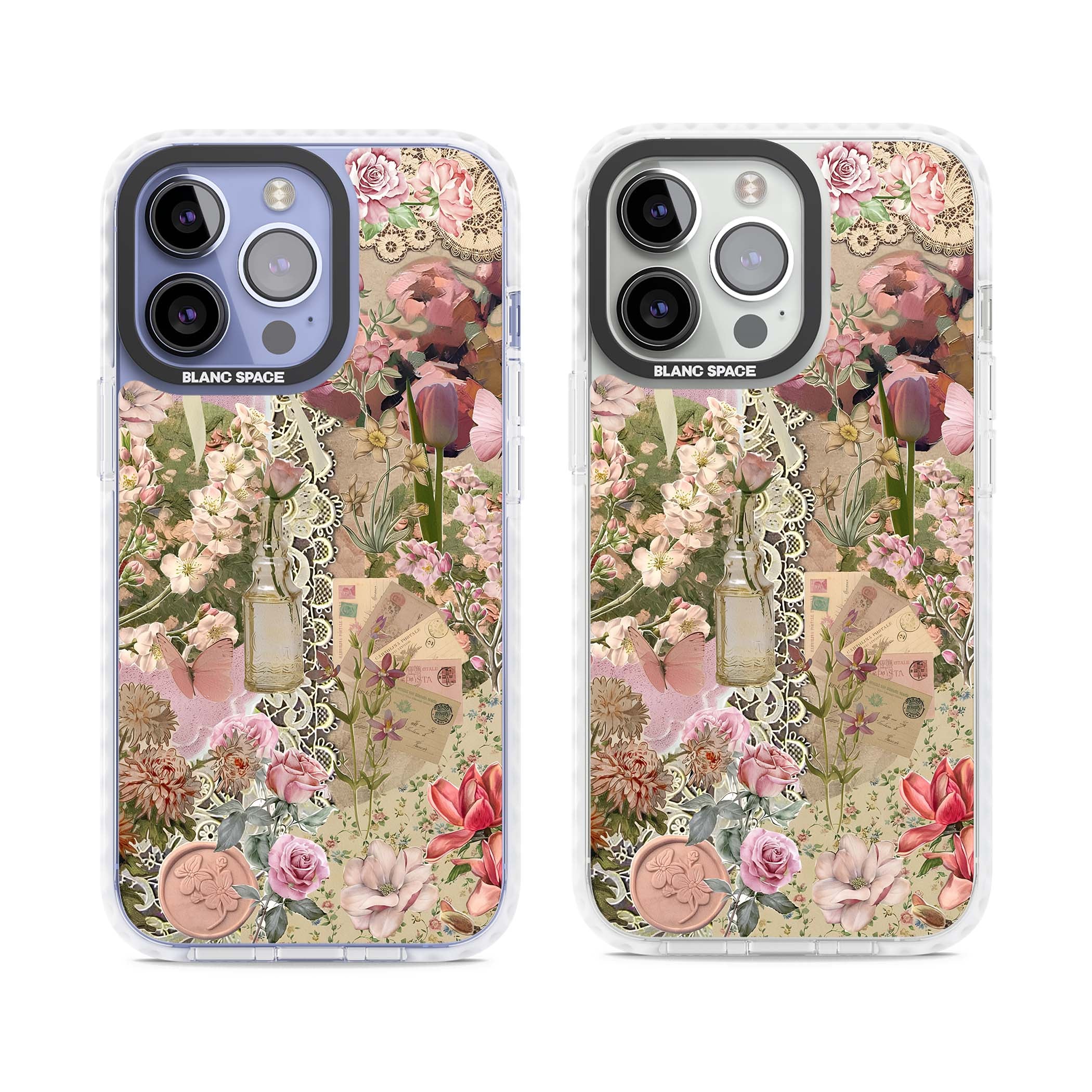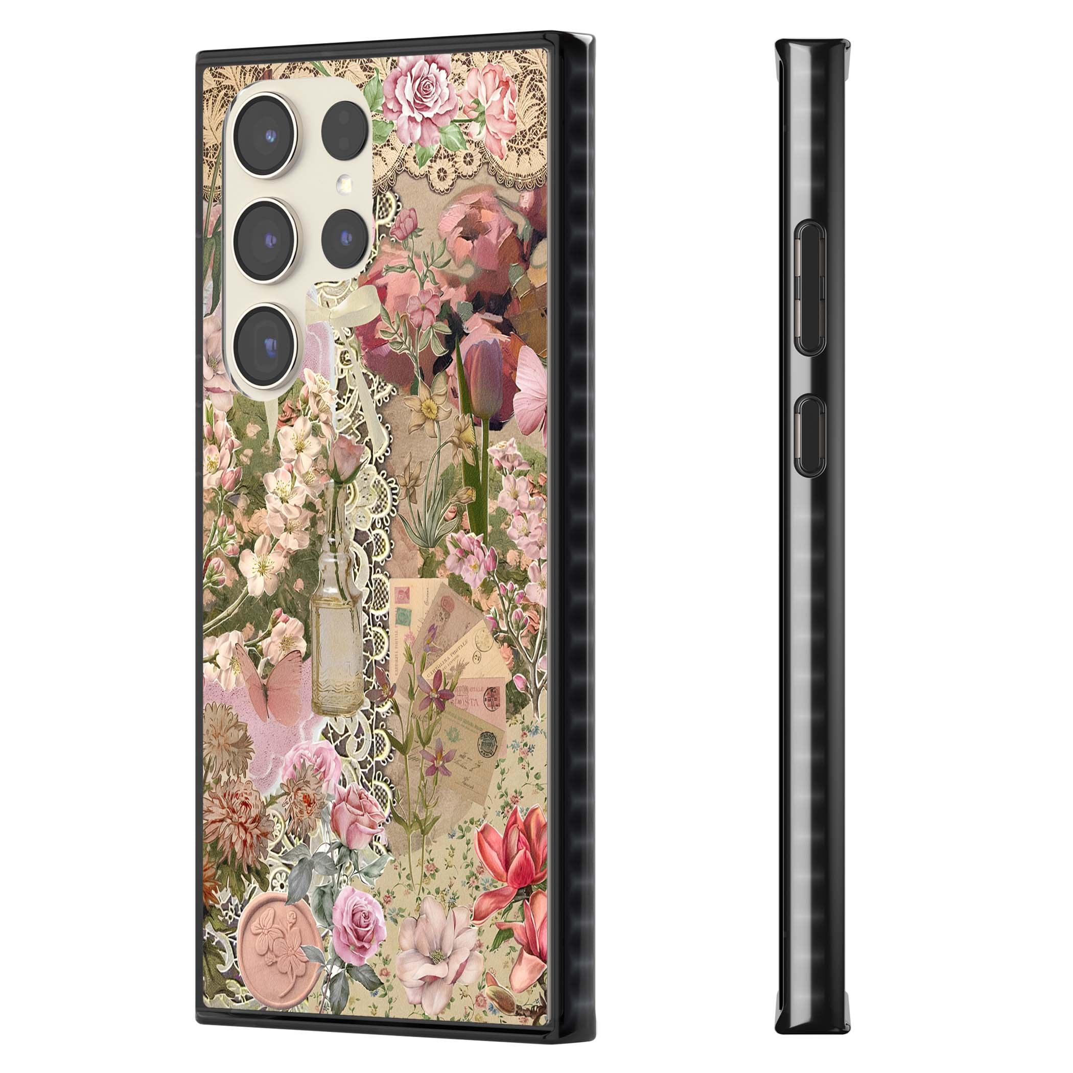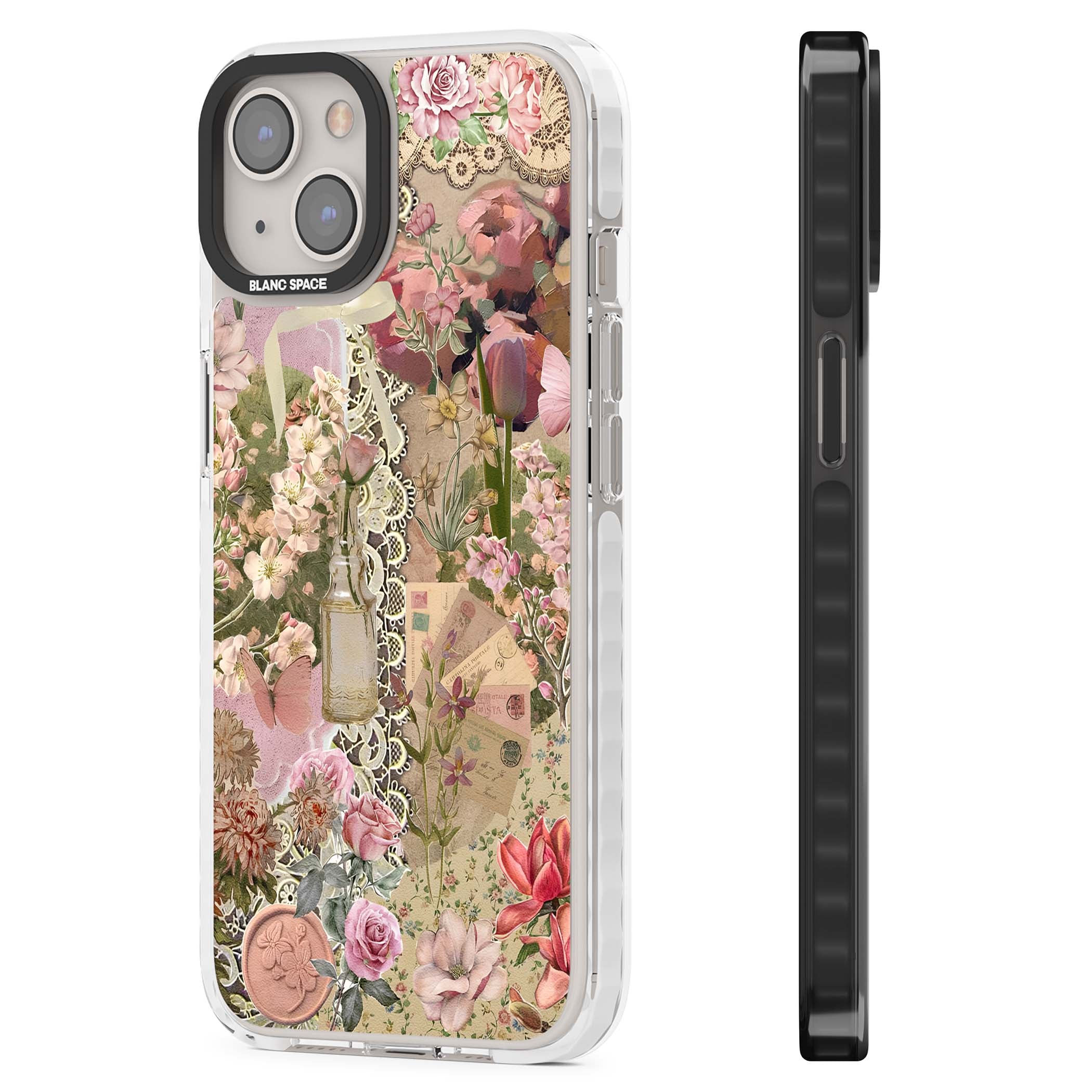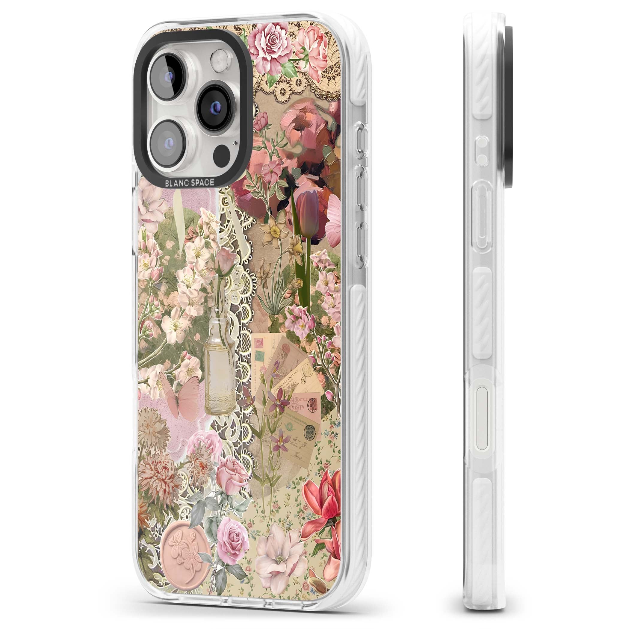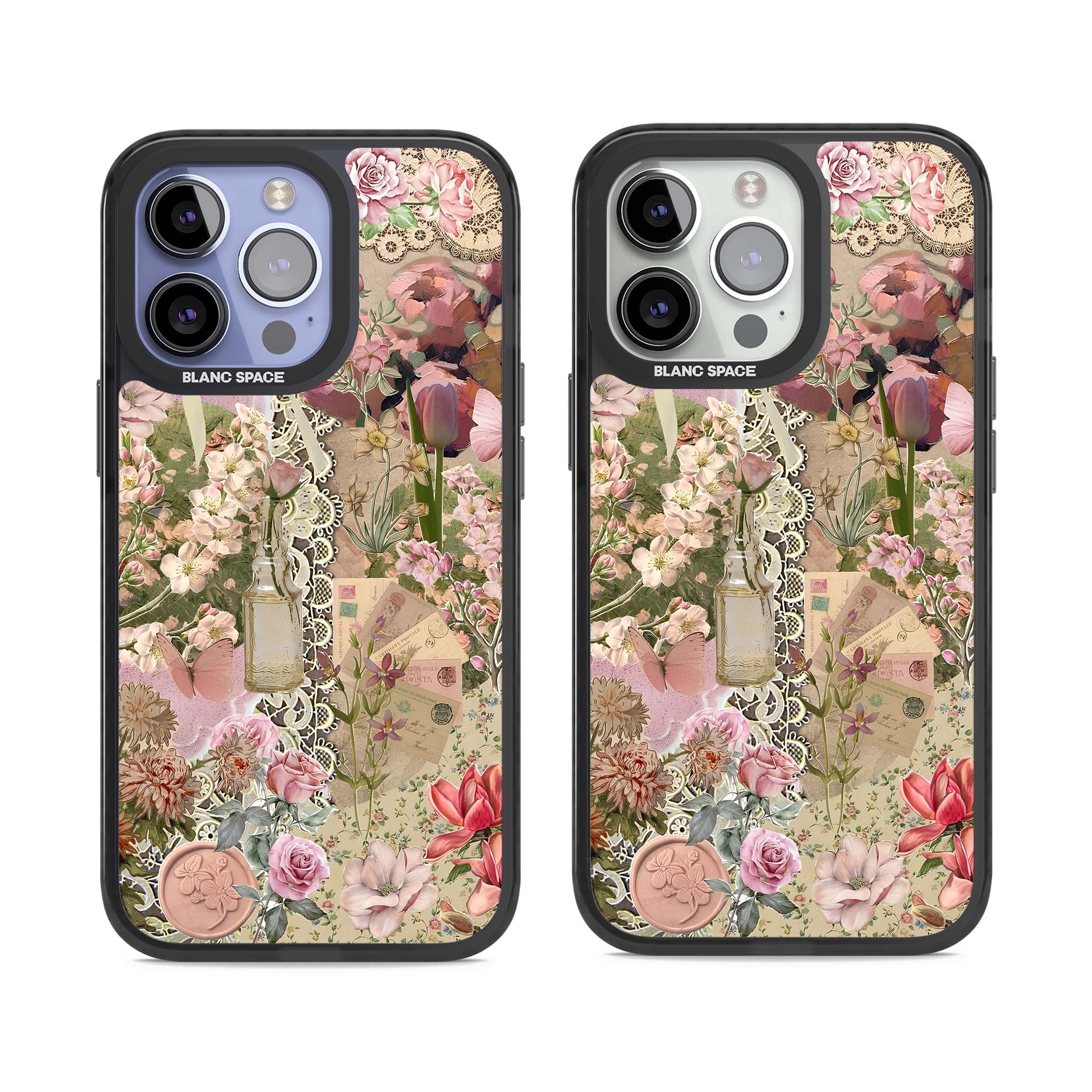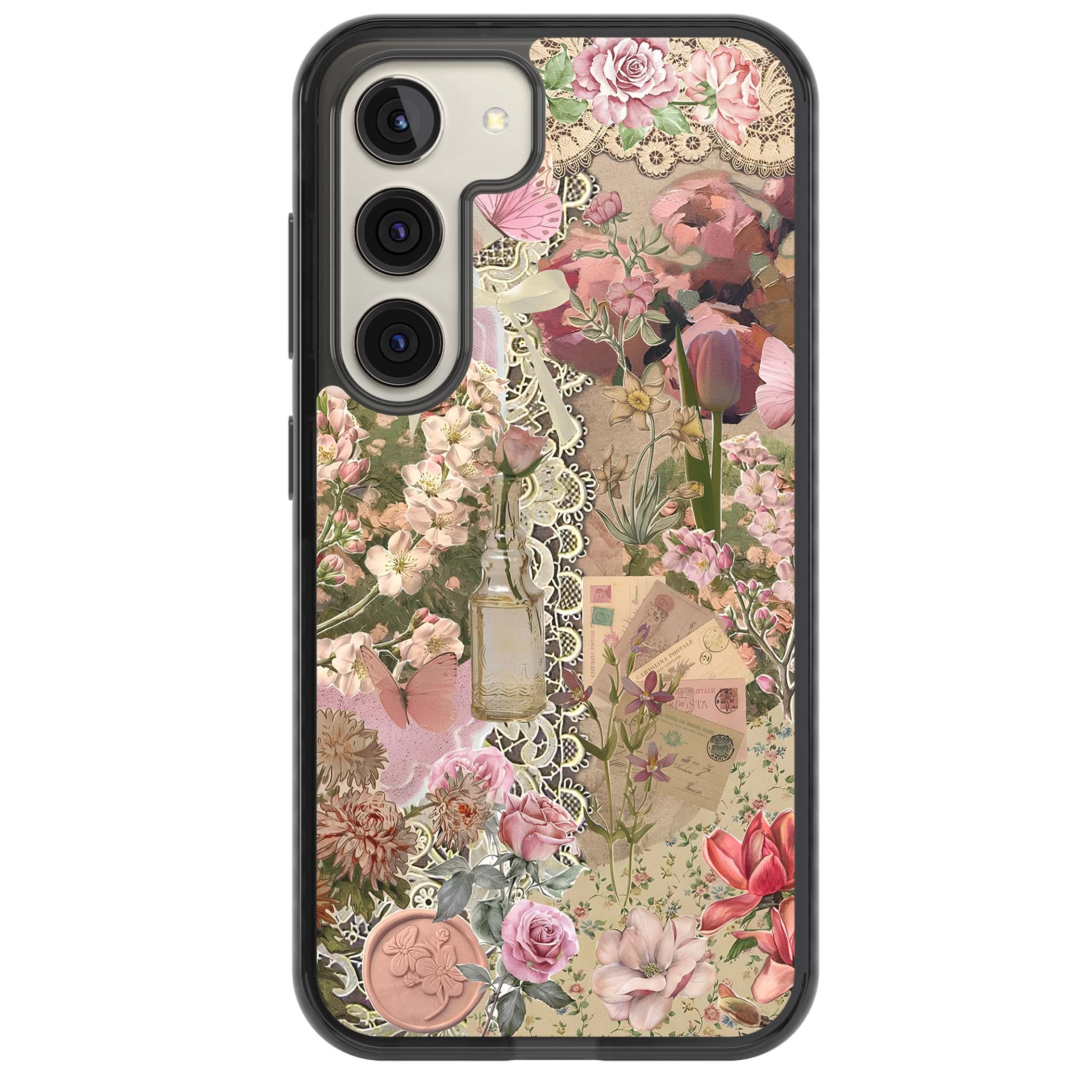 A romantic blend of pink florals, lace, letters, butterflies, and vintage perfume bottles, this phone case is a perfect match for those who adore soft, feminine aesthetics.