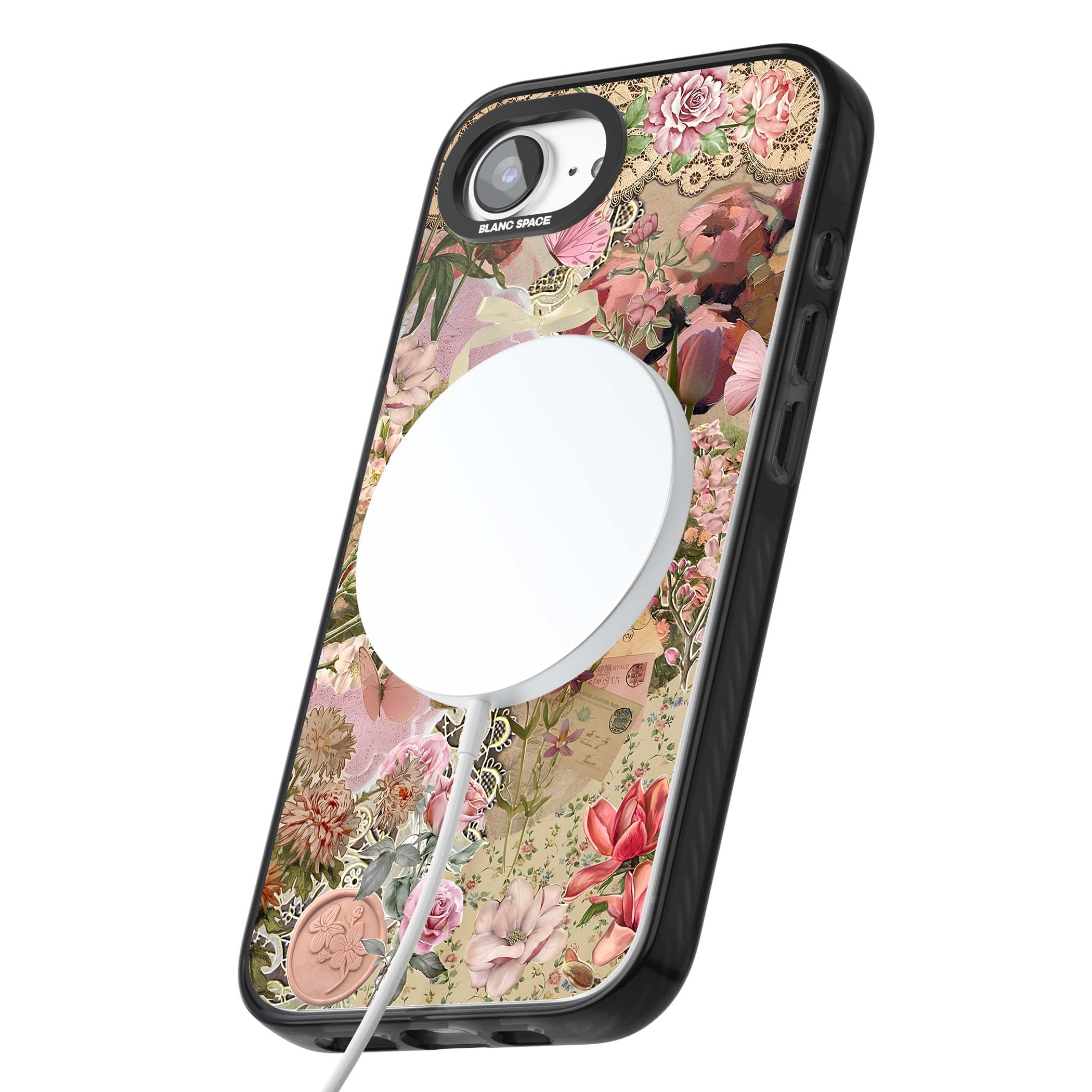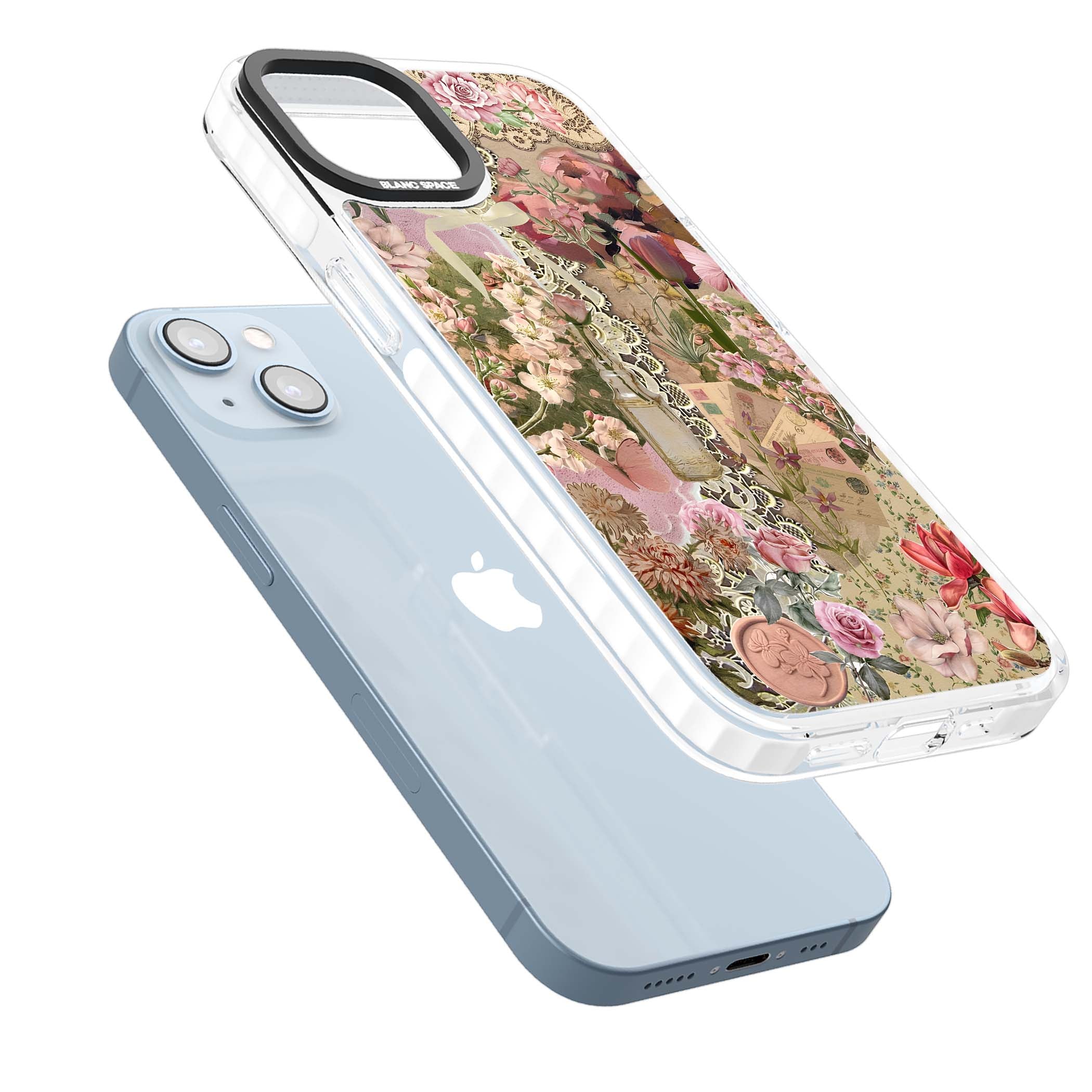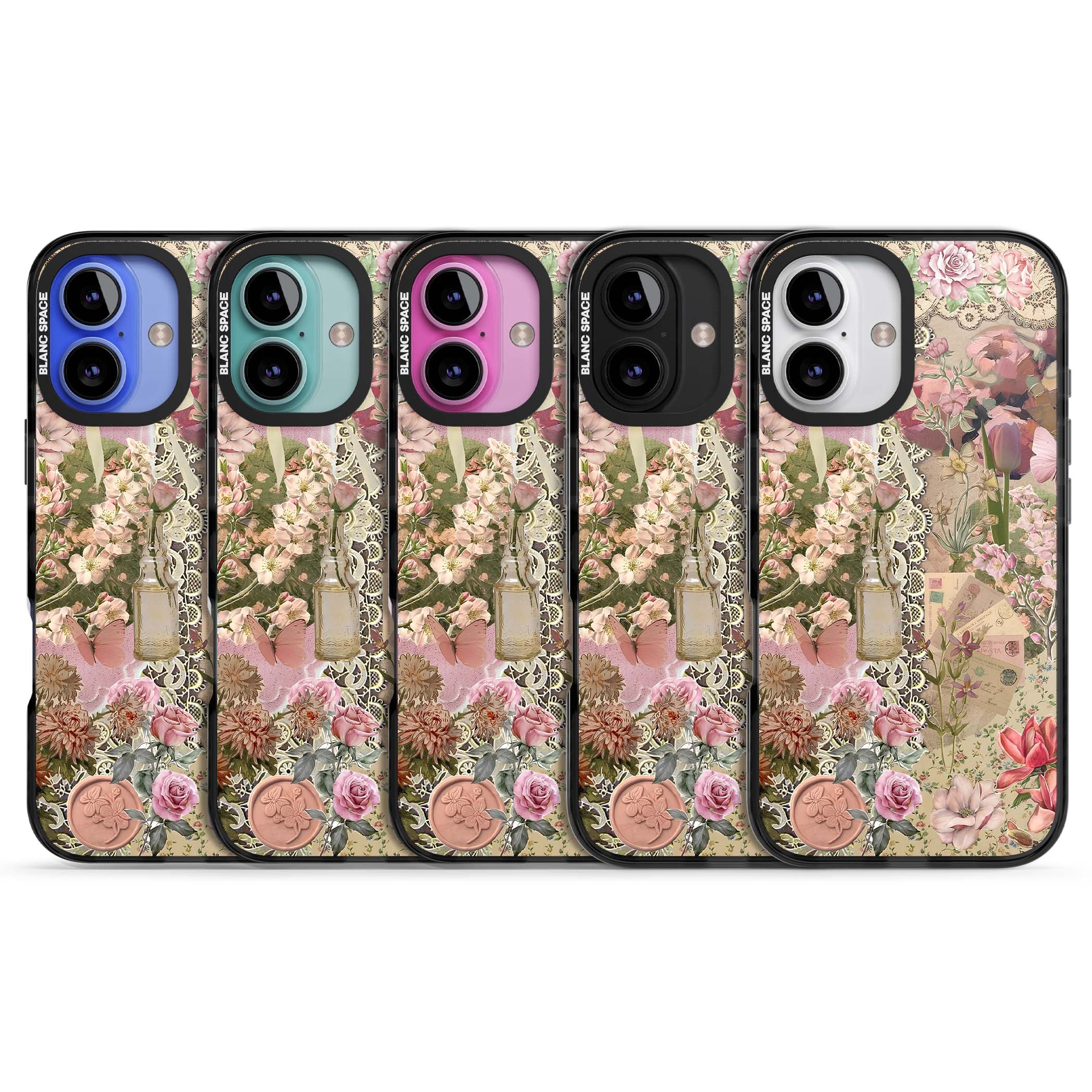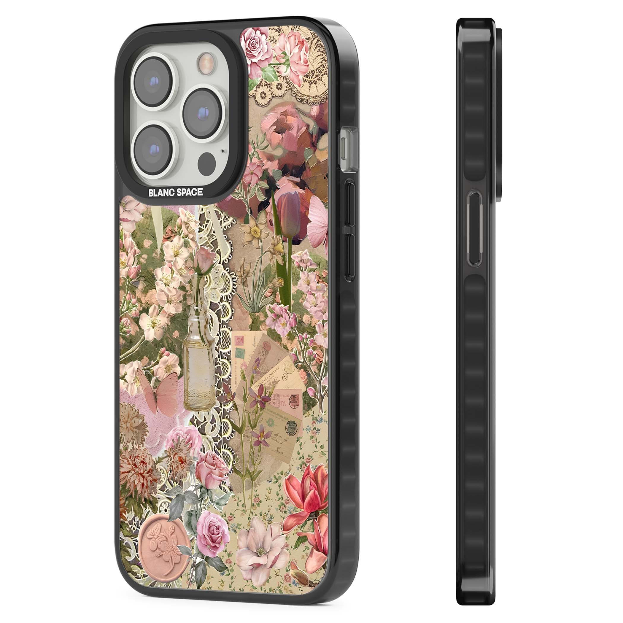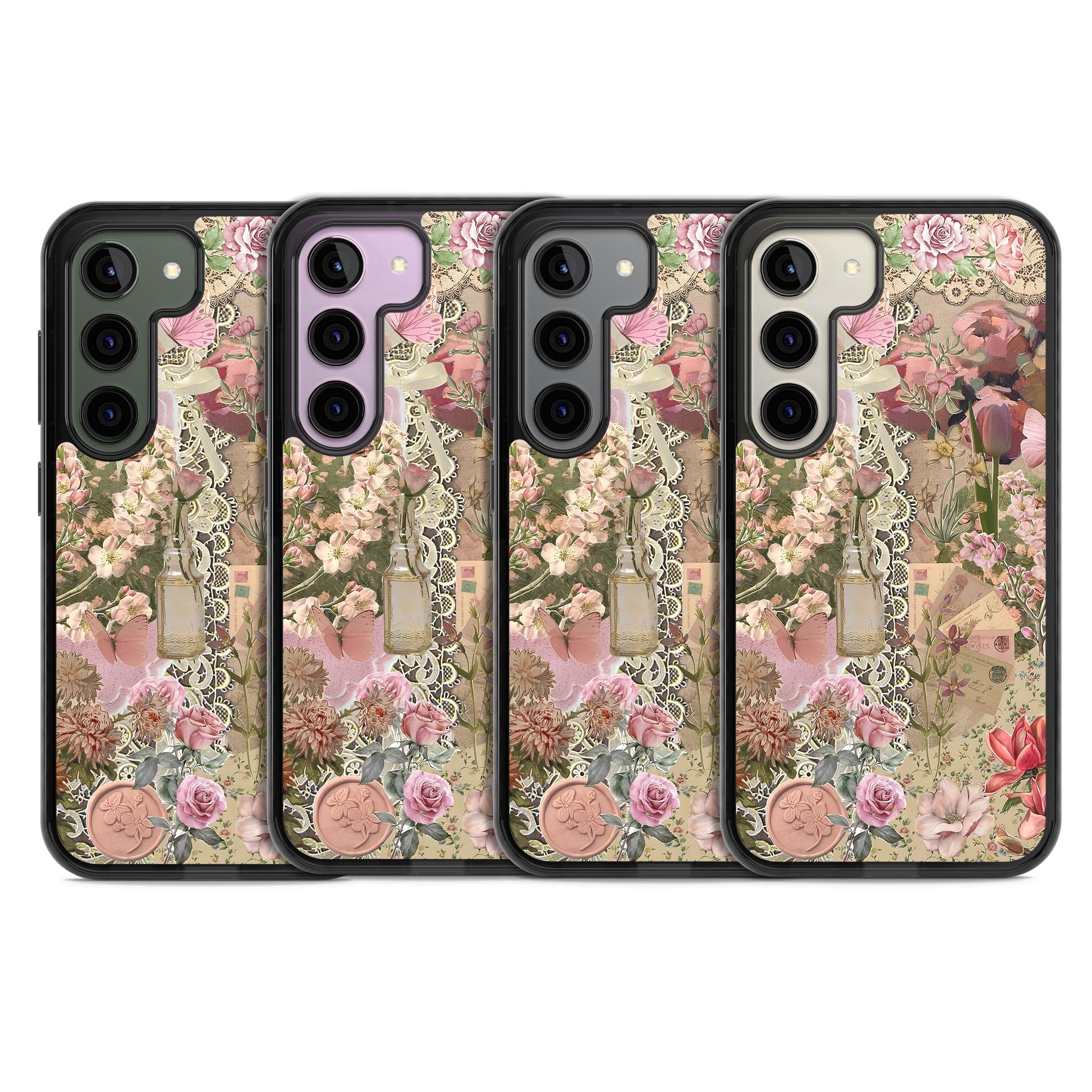 A romantic blend of pink florals, lace, letters, butterflies, and vintage perfume bottles, this phone case is a perfect match for those who adore soft, feminine aesthetics.