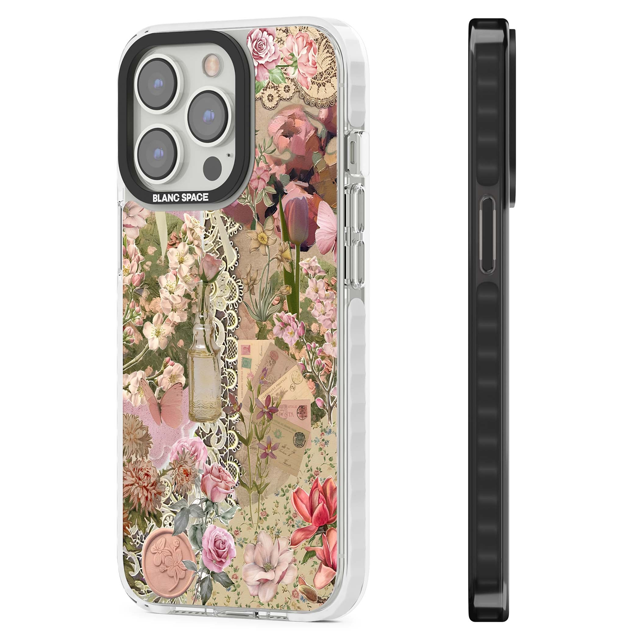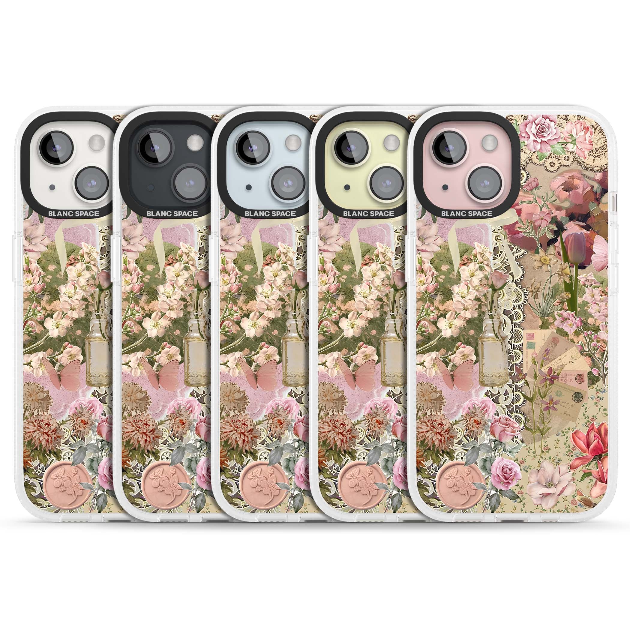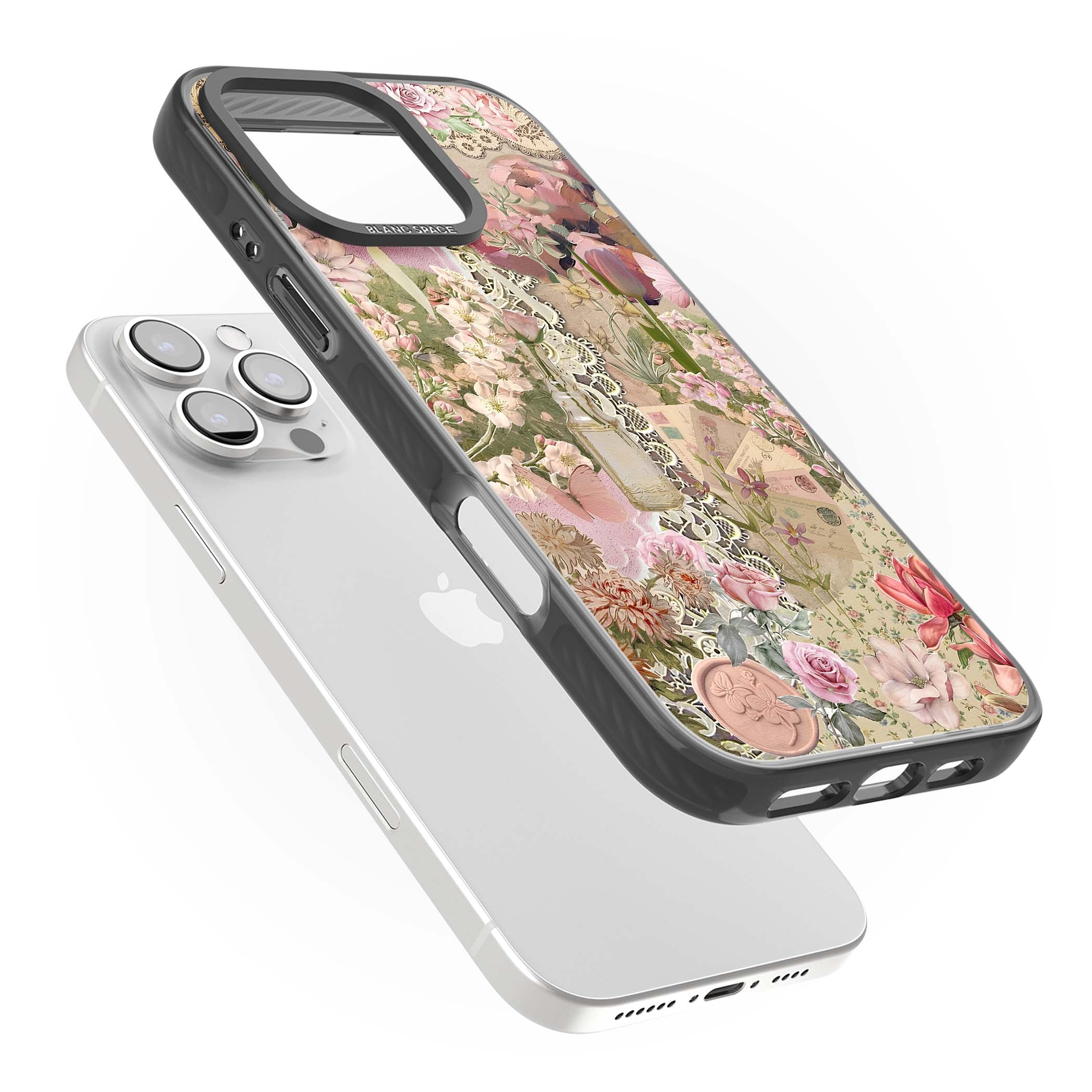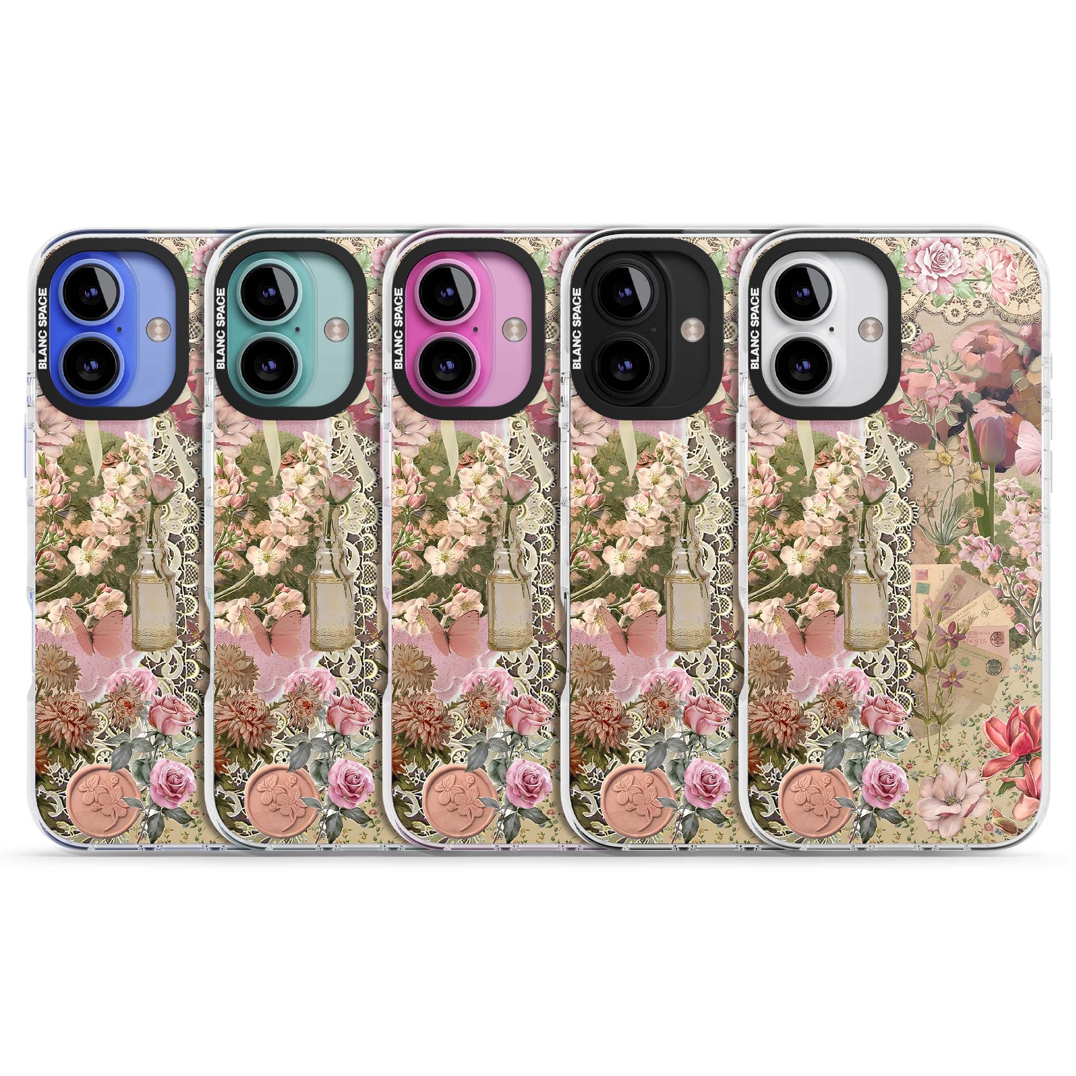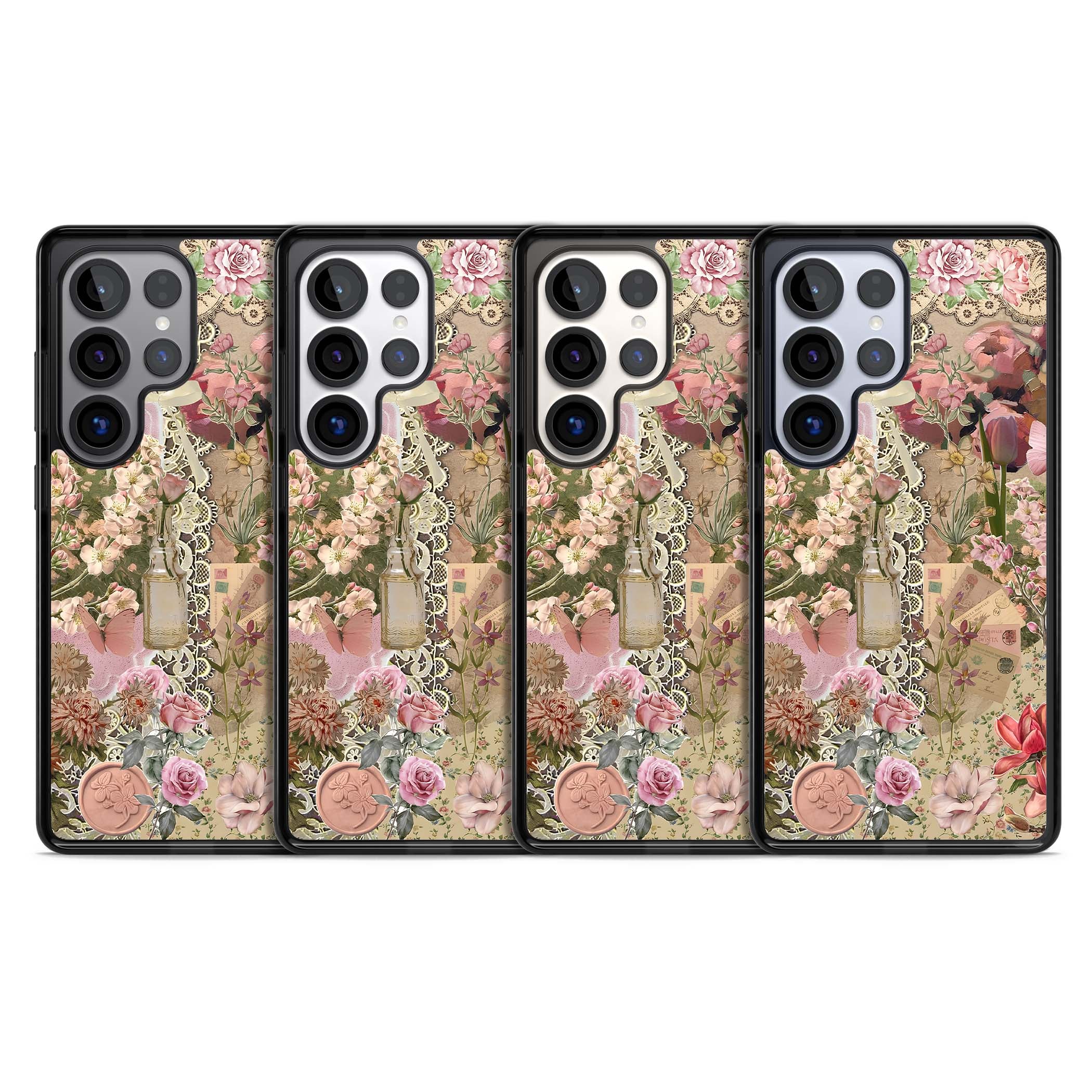 A romantic blend of pink florals, lace, letters, butterflies, and vintage perfume bottles, this phone case is a perfect match for those who adore soft, feminine aesthetics.