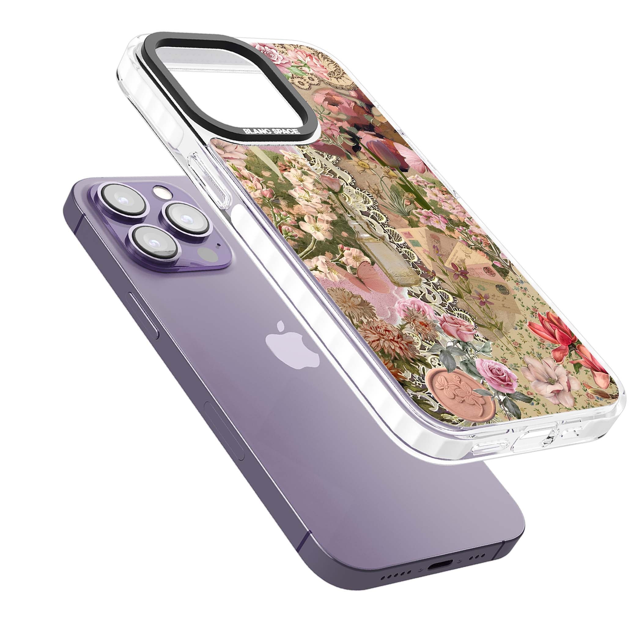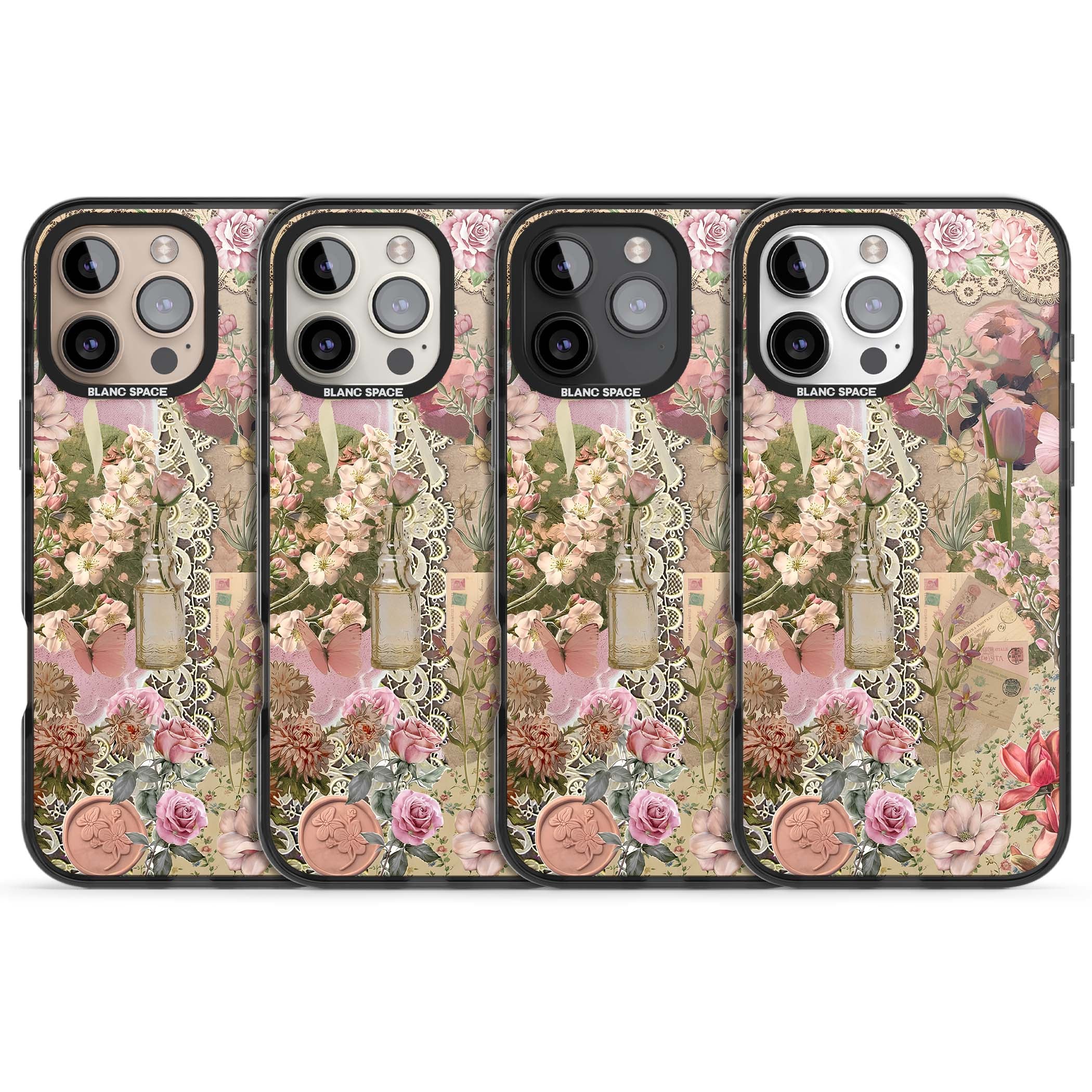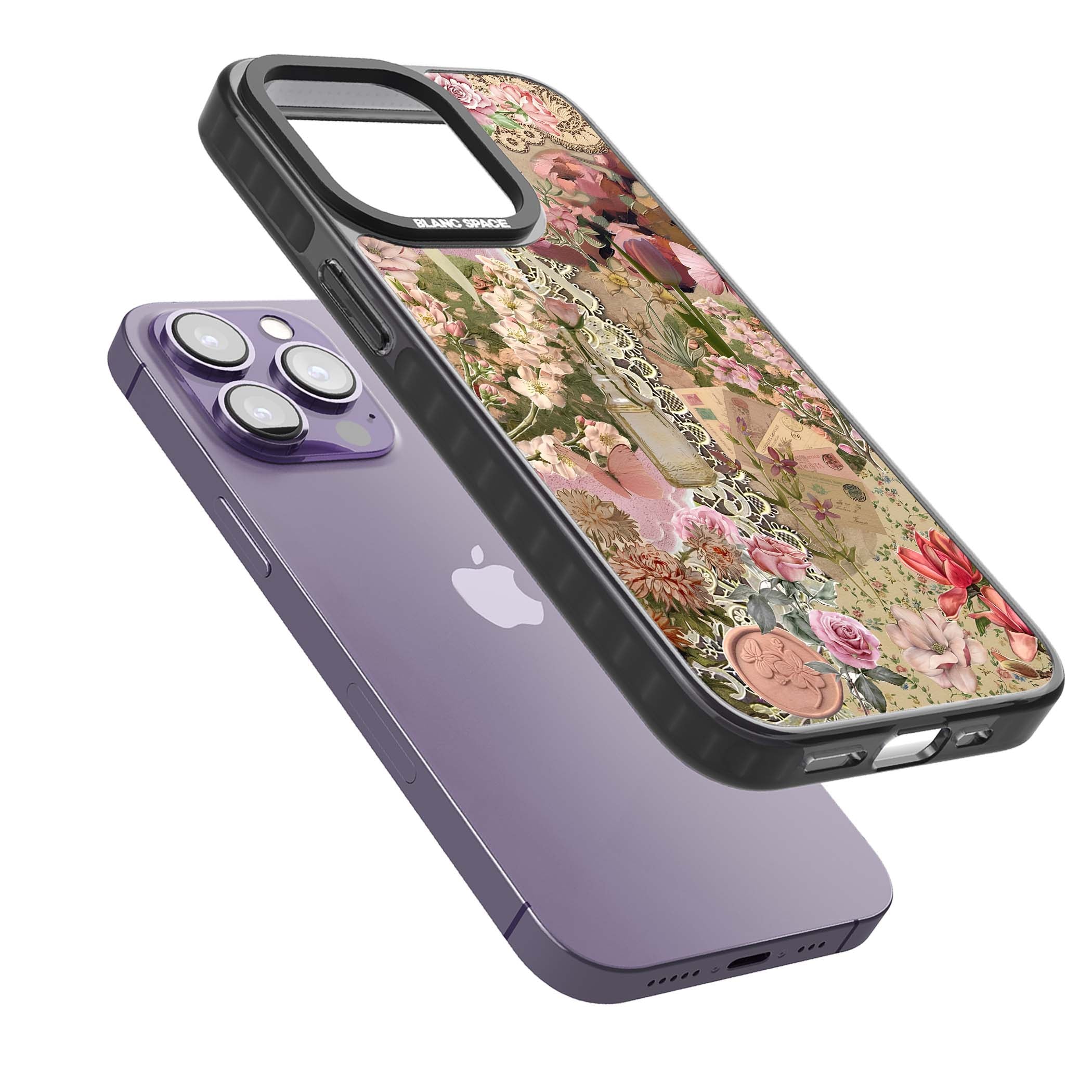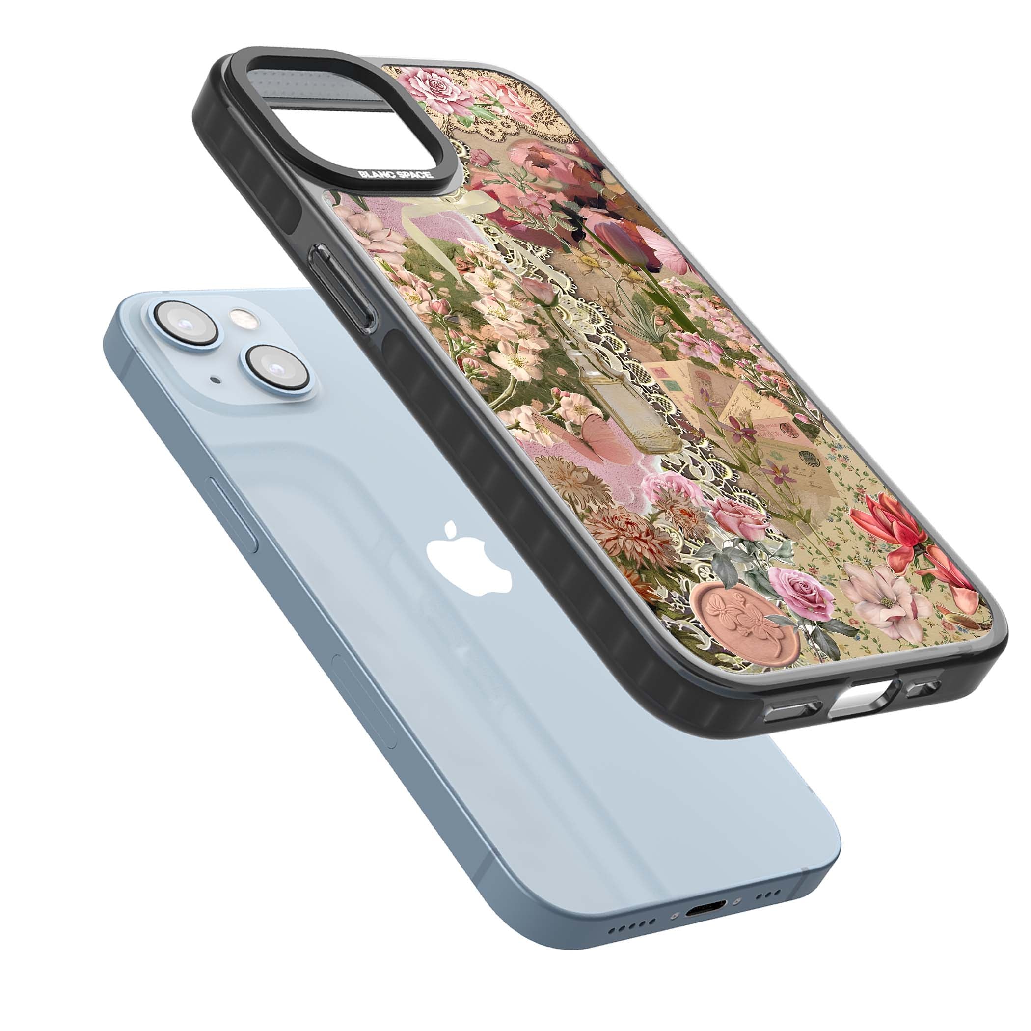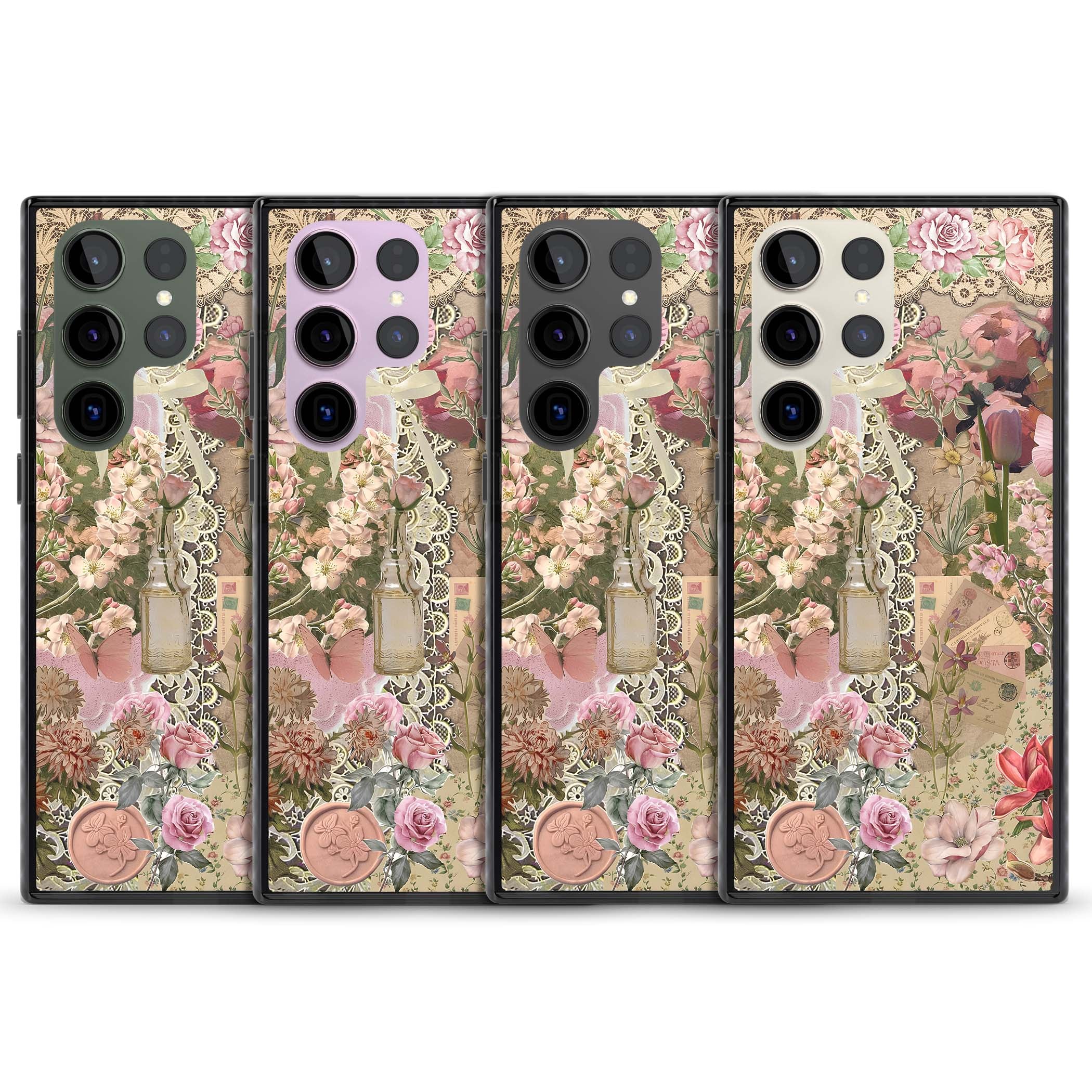 A romantic blend of pink florals, lace, letters, butterflies, and vintage perfume bottles, this phone case is a perfect match for those who adore soft, feminine aesthetics.