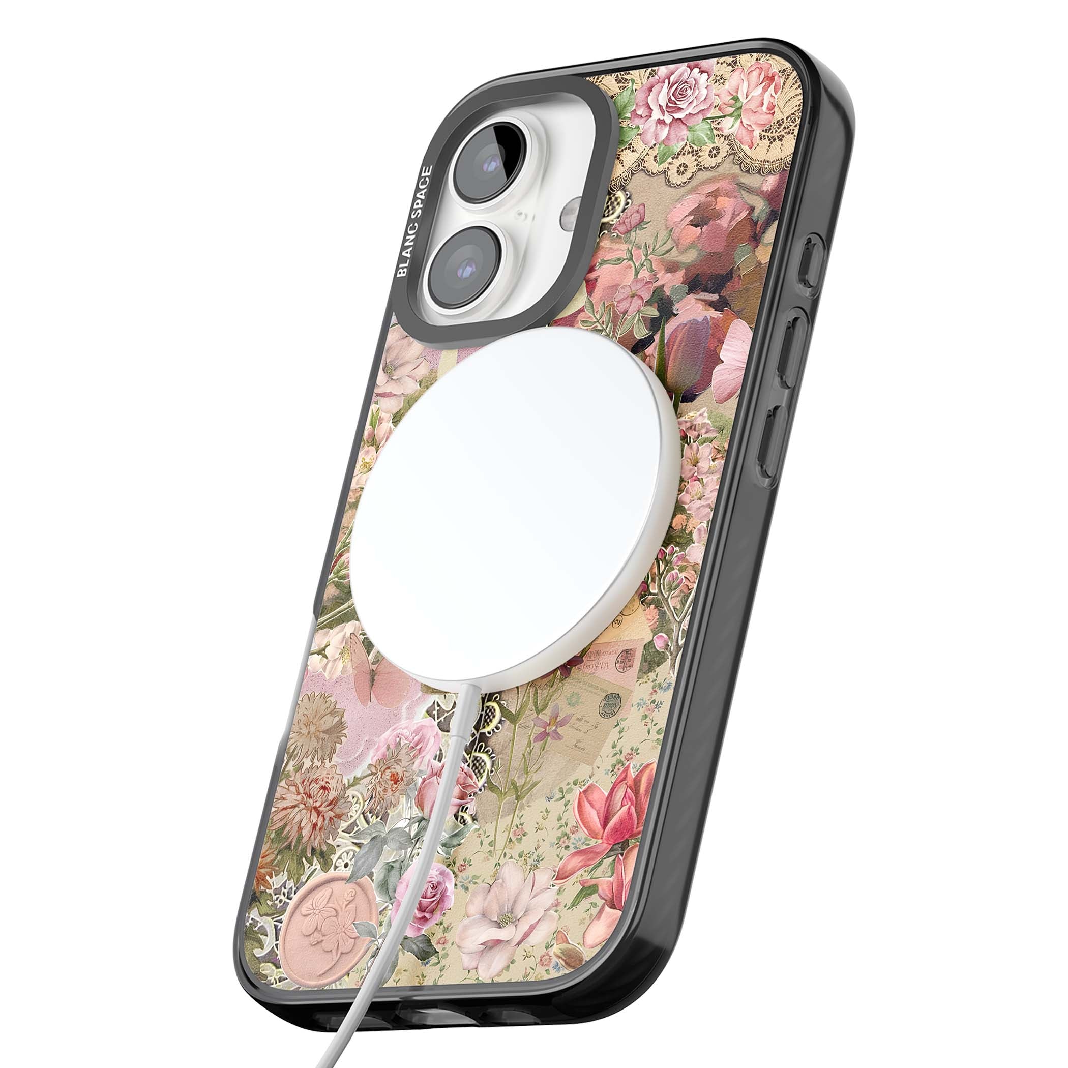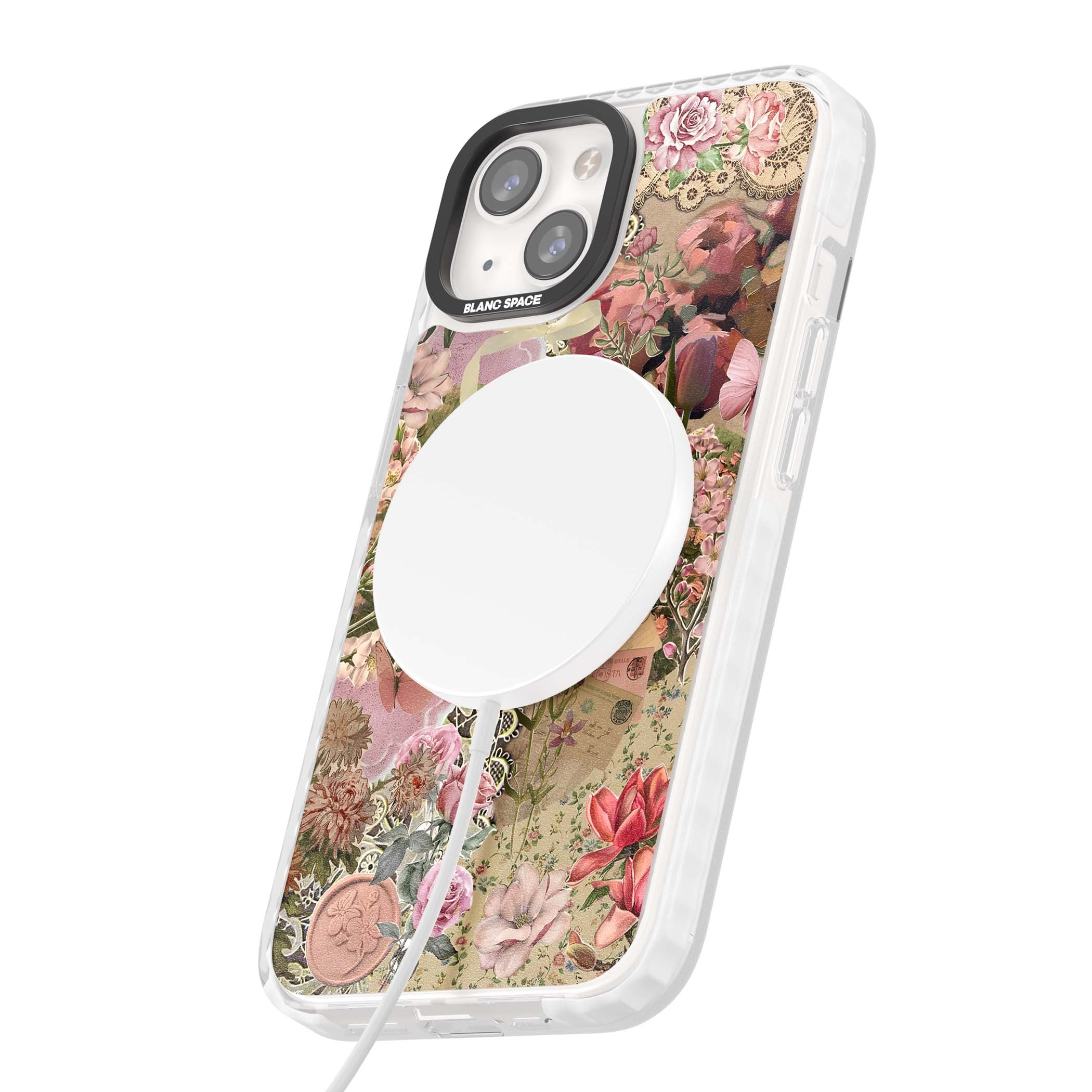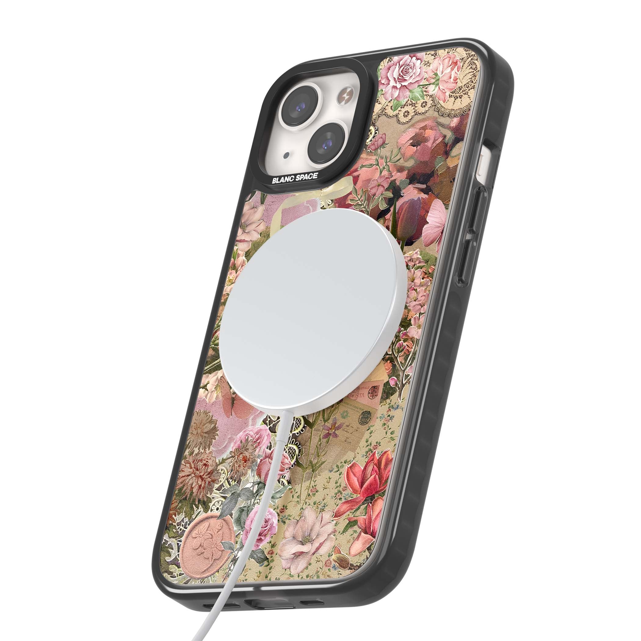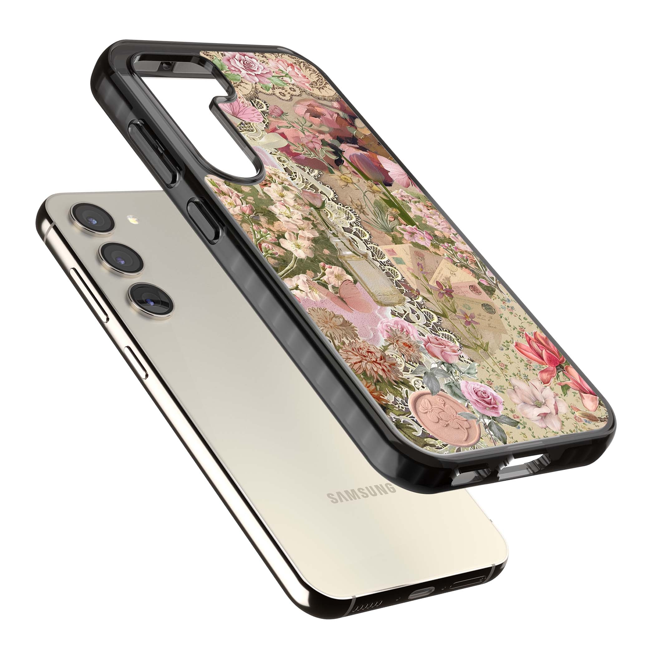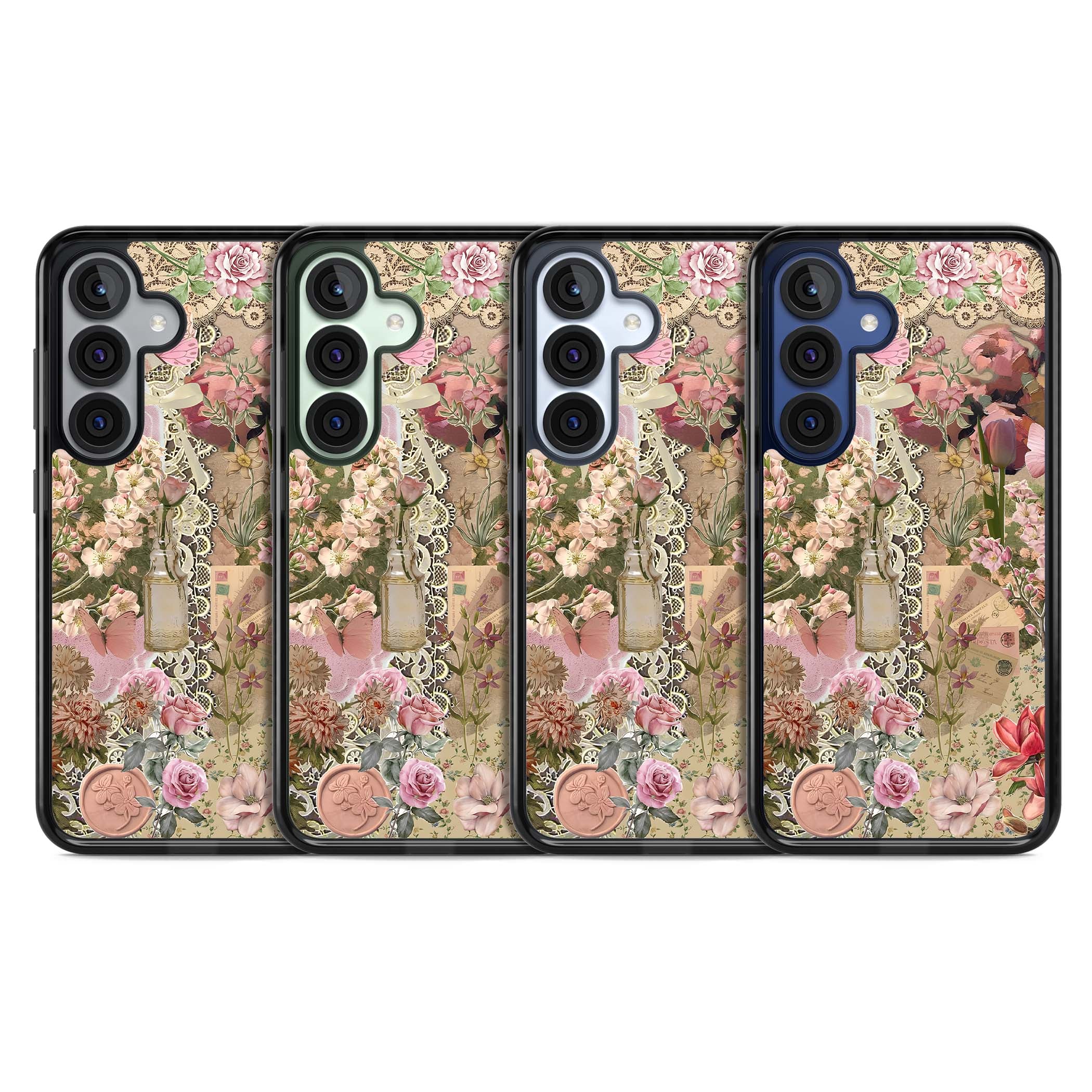 A romantic blend of pink florals, lace, letters, butterflies, and vintage perfume bottles, this phone case is a perfect match for those who adore soft, feminine aesthetics.