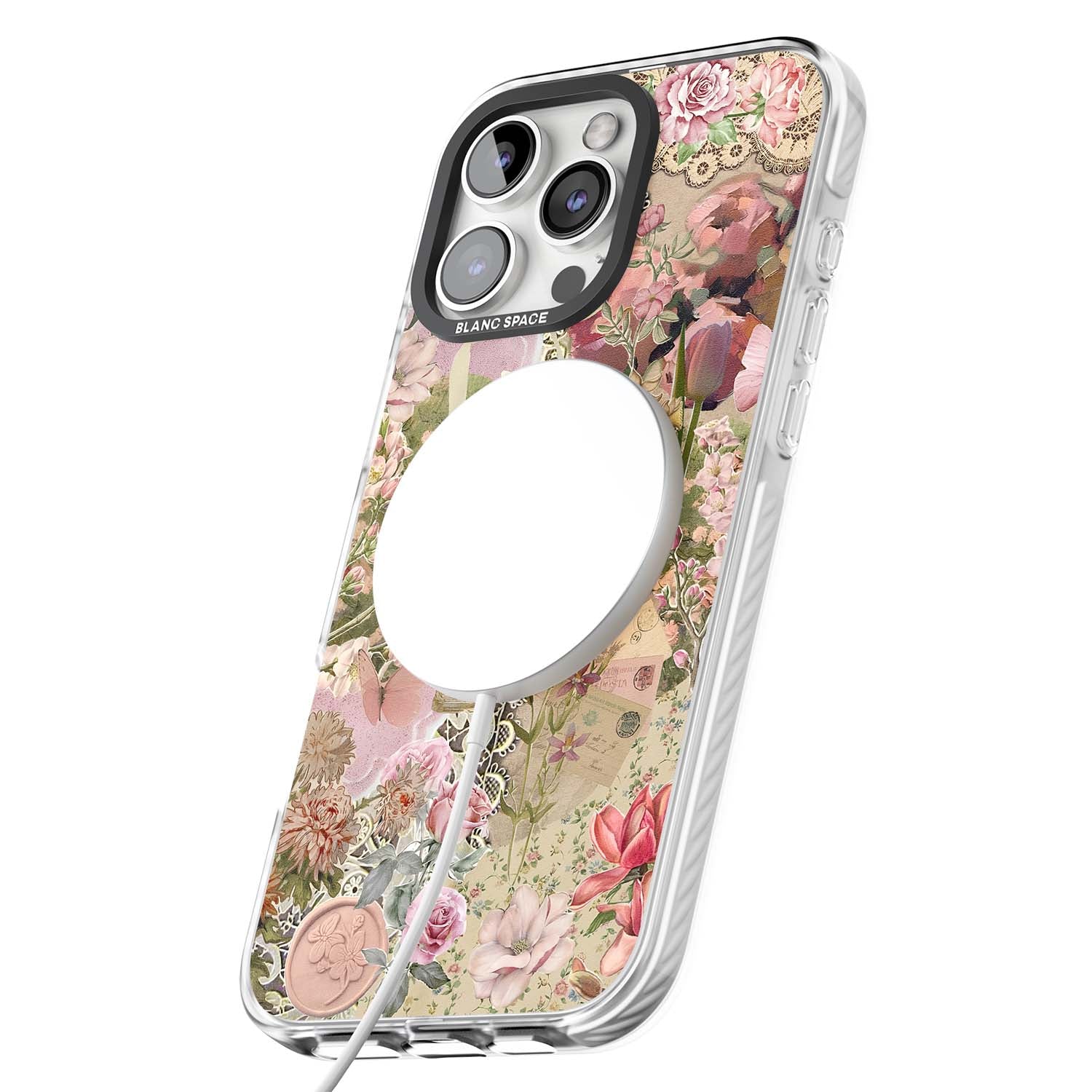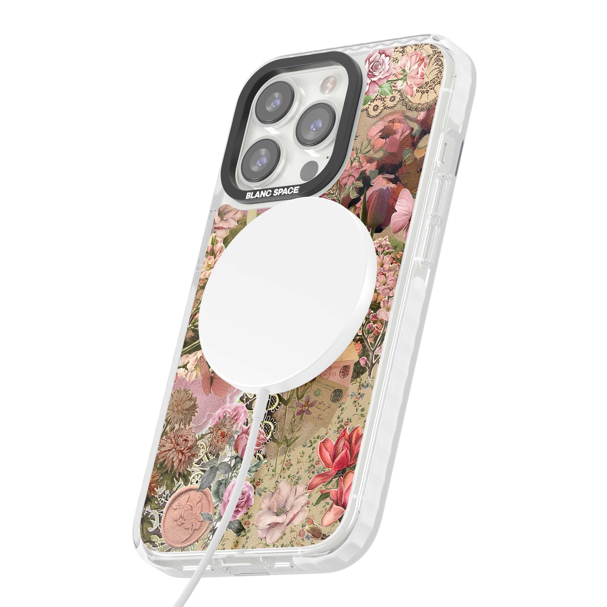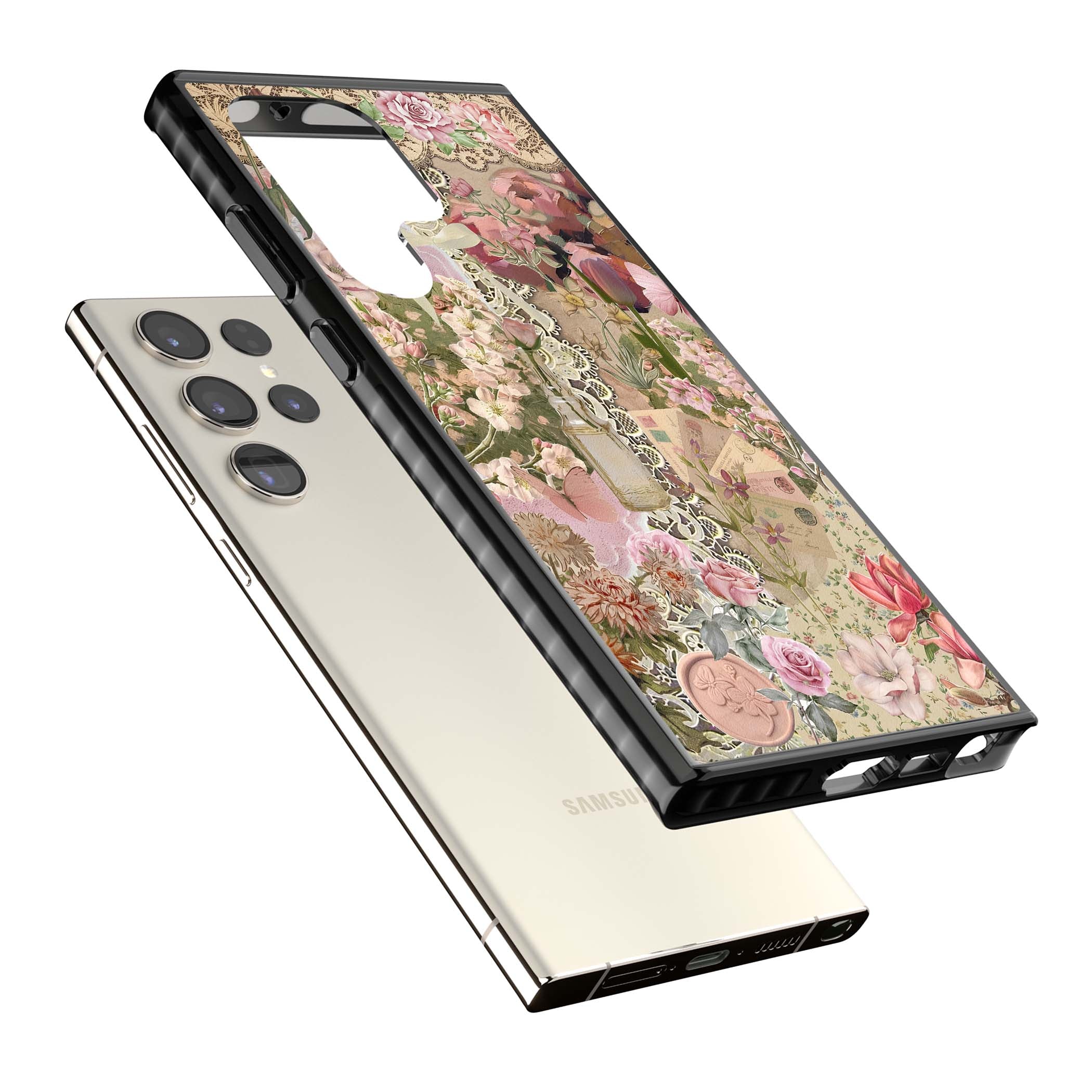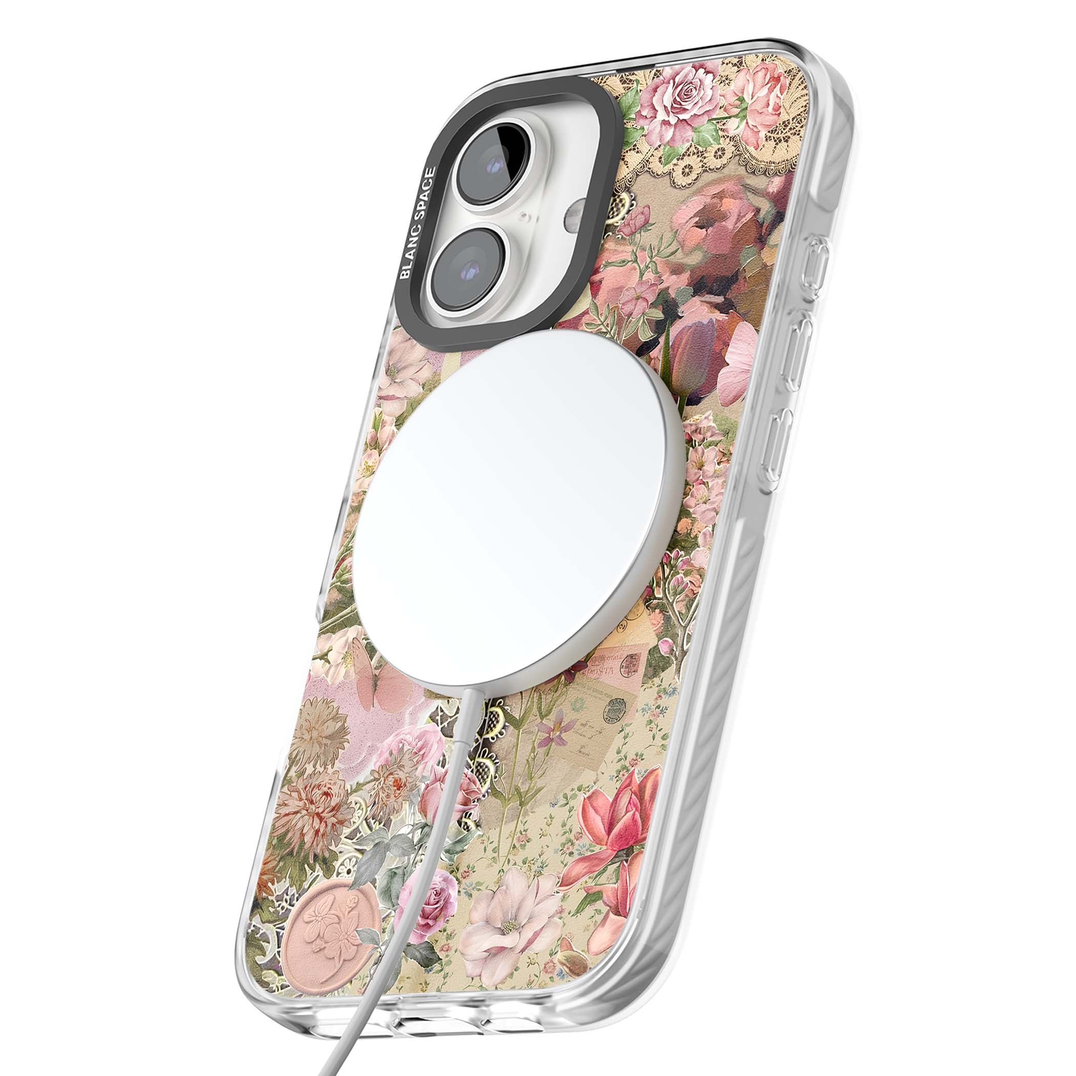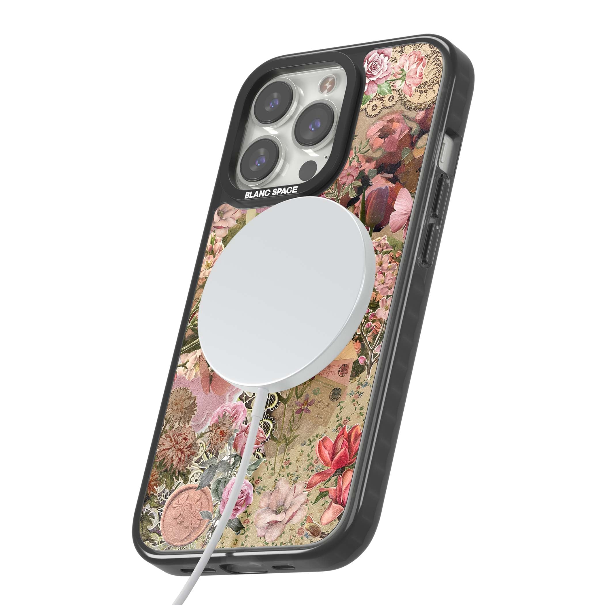 A romantic blend of pink florals, lace, letters, butterflies, and vintage perfume bottles, this phone case is a perfect match for those who adore soft, feminine aesthetics.